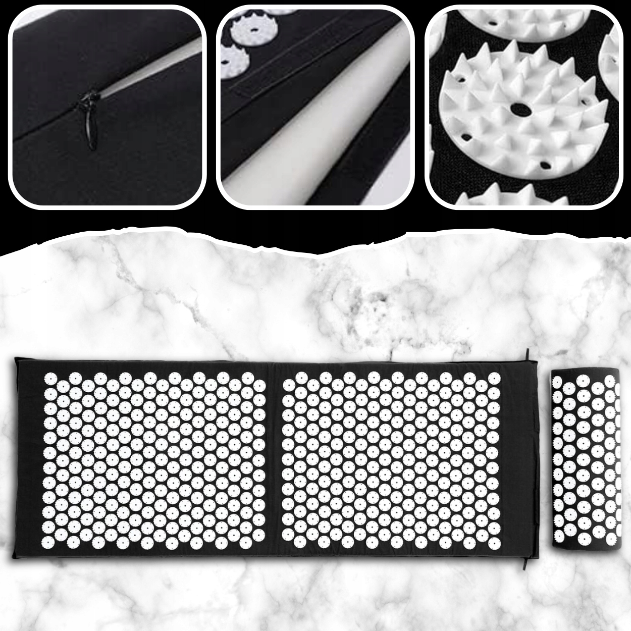 Акупресура з подушкою -це преміальний продукт найвищої якості. 100%бавовна використовується для зшивання килима. Цей делікатний і м'який на дотик природного матеріалу забезпечує дихання та адекватну циркуляцію повітря . Це робить килимок доброзичливим як до шкіри, так і до навколишнього середовища. Комфорт і комфорт брехні чи сидіння забезпечується м'якою піною, яка наповнює наволочки килима та подушок.