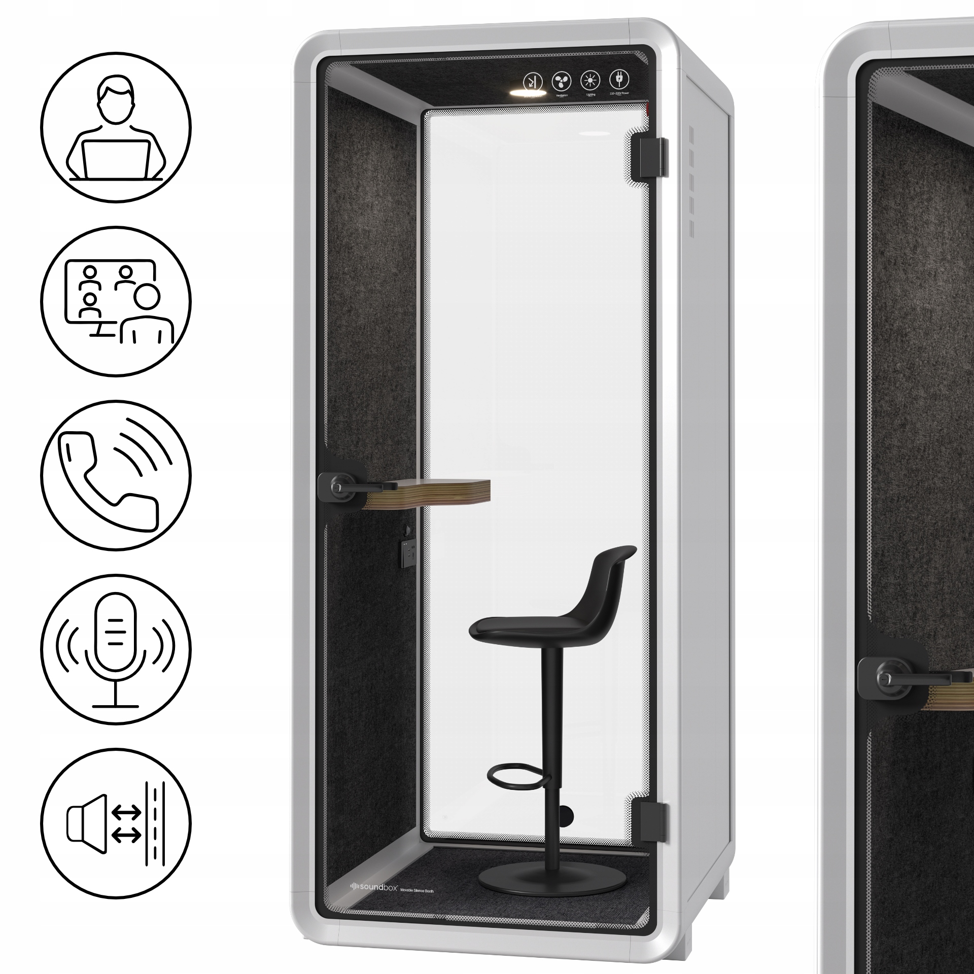 ▶ компактна та функціональна телефонна кабінка - ідеально вписується в сучасні офіси, орієнтовані на інноваційні рішення, що підтримують комфорт роботи та спілкування.
