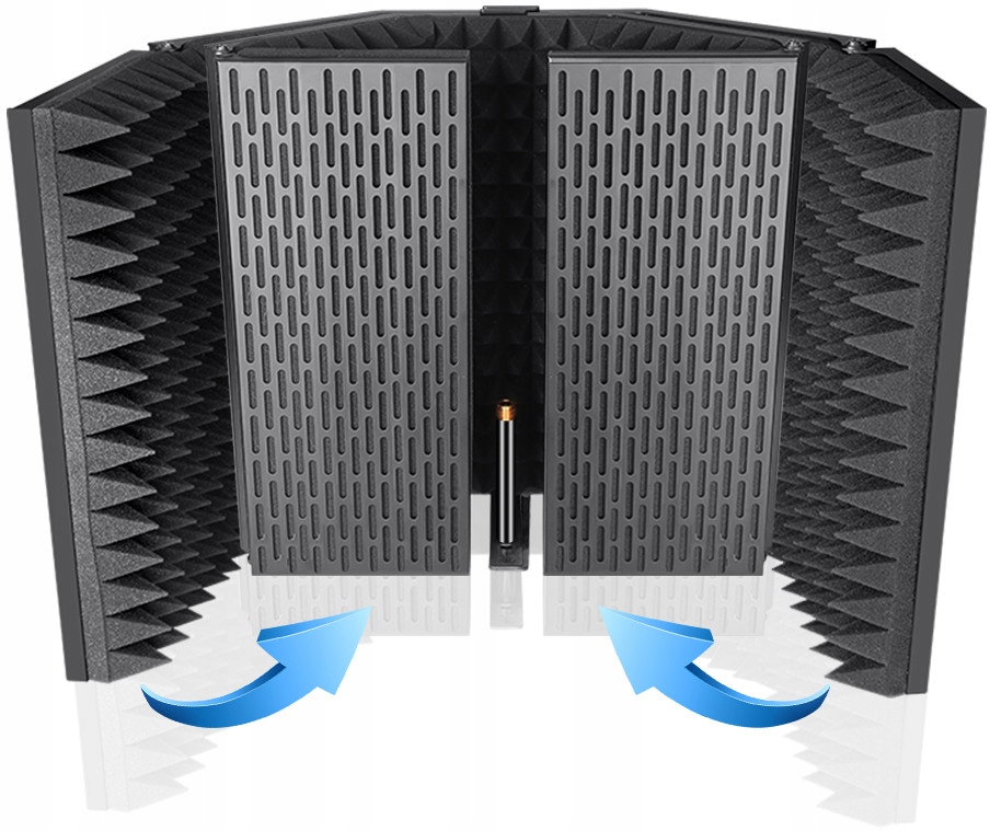 Його унікальними особливостями є проста структура та легка конфігурація. Завдяки малій вазі та частково складаній конструкції він стає портативним рішенням усіх проблем несприятливих кімнат для запису. Екран кріпиться за допомогою металевої скоби. Це гарантує високу жорсткість і стійкість до пошкоджень. Кріплення з подвійним затискачем для легкого та стабільного кріплення на підлоговій підставці всього за кілька секунд. Зовнішні 2 панелі складаються для зручного зберігання та створюють регульований звукоізоляційний простір. Це також значно покращить можливості студії в приміщеннях, які не пристосовані для цієї мети.