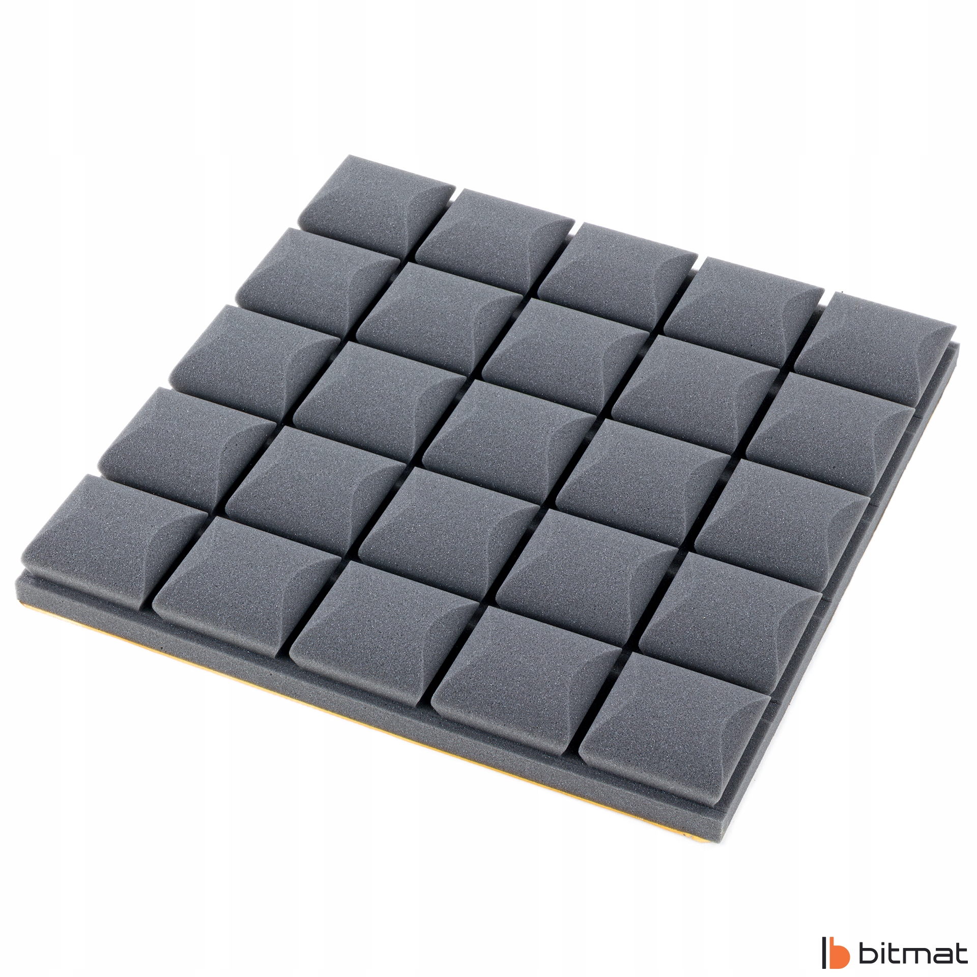 Акустичний пінопласт у вигляді опуклого куба 50 см х 50 см від Bitmat дуже хороший спосіб поліпшити акустику в житлових, офісних і репетиційних приміщеннях, а також захист від небажаних звукових відбитків. Піна з відкритою комірковою структурою призначена для поглинання та розсіювання звукових хвиль для усунення відлуння та скорочення часу реверберації. Окрім своїх акустичних властивостей, він також пропонує привабливий зовнішній вигляд, який підійде для більшості приміщень.
