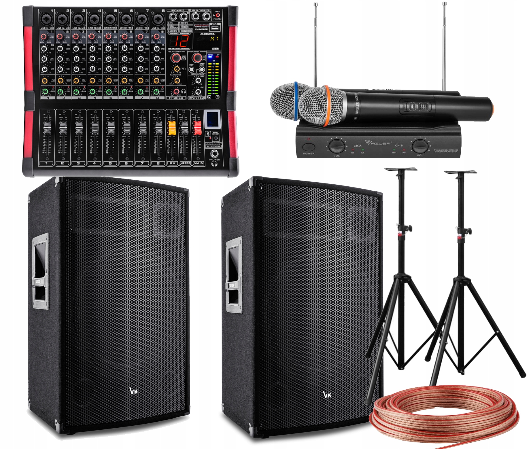 Сценічний декор, виготовлений за найвищими стандартами з найкращих матеріалів. Ідеально підходить для звукових систем під час заходів на відкритому повітрі або середніх і великих приміщень. Набір характеризується високою гучністю звуку і міцністю. Завдяки цьому обладнанню ми можемо забезпечити озвучення заходів до 300 осіб. Це найпотужніший набір у своєму класі.