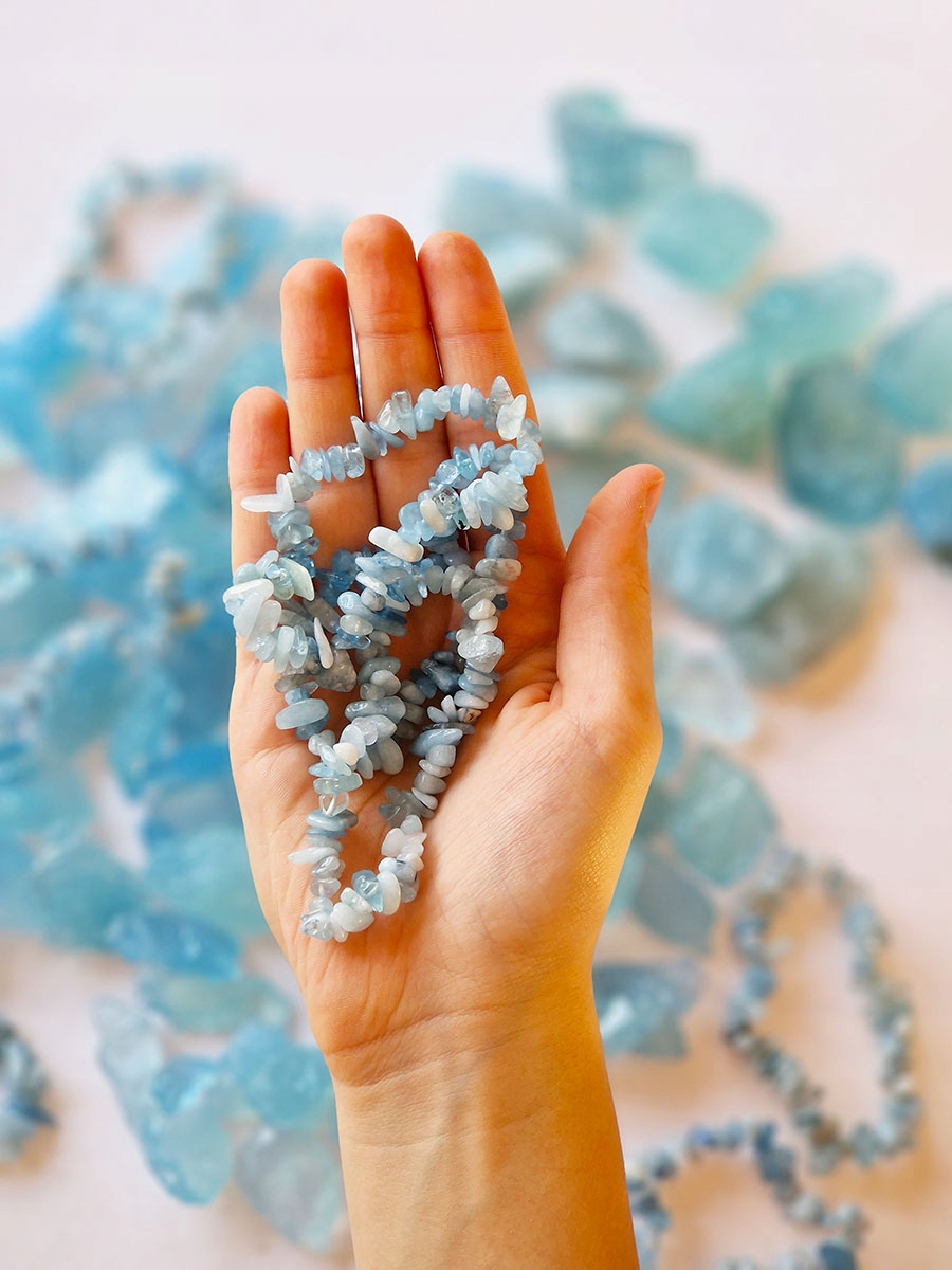 Це синьо-зелений різновид берилу. Його назва походить з латини і означає «морська вода». Створює враження «мокрого каменю», від чого красиво переливається.