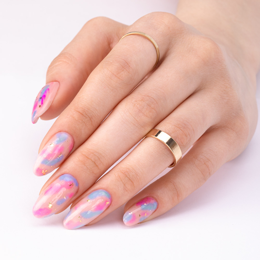 ☘️ Нанесіть MollyLac ART WATER COLOR на гібридний лак, почекайте поки він випарується, для досягнення розмитого ефекту використовуйте очищувач. і розподіліть його тонким пензликом.