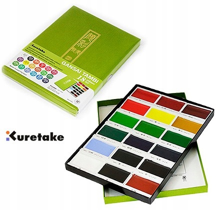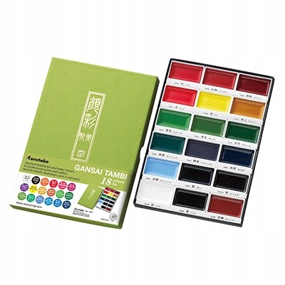 Набір акварельних фарб Gansai Tambi японської фірми Kuretake, 18 кольорів. Нетоксичні традиційні японські акварельні фарби з насиченими інтенсивними кольорами. Більш покривна, ніж інші фарби цього типу (наприклад, Cotman або Sennelier). Розмір «кнопок» набагато більший, ніж у інших фарб, доступних на ринку, що приносить багато переваг - напр. можливість працювати великим пензлем, випадково не забруднившись сусіднім кольором. Все це вкладено в елегантну зелену картонну коробку.