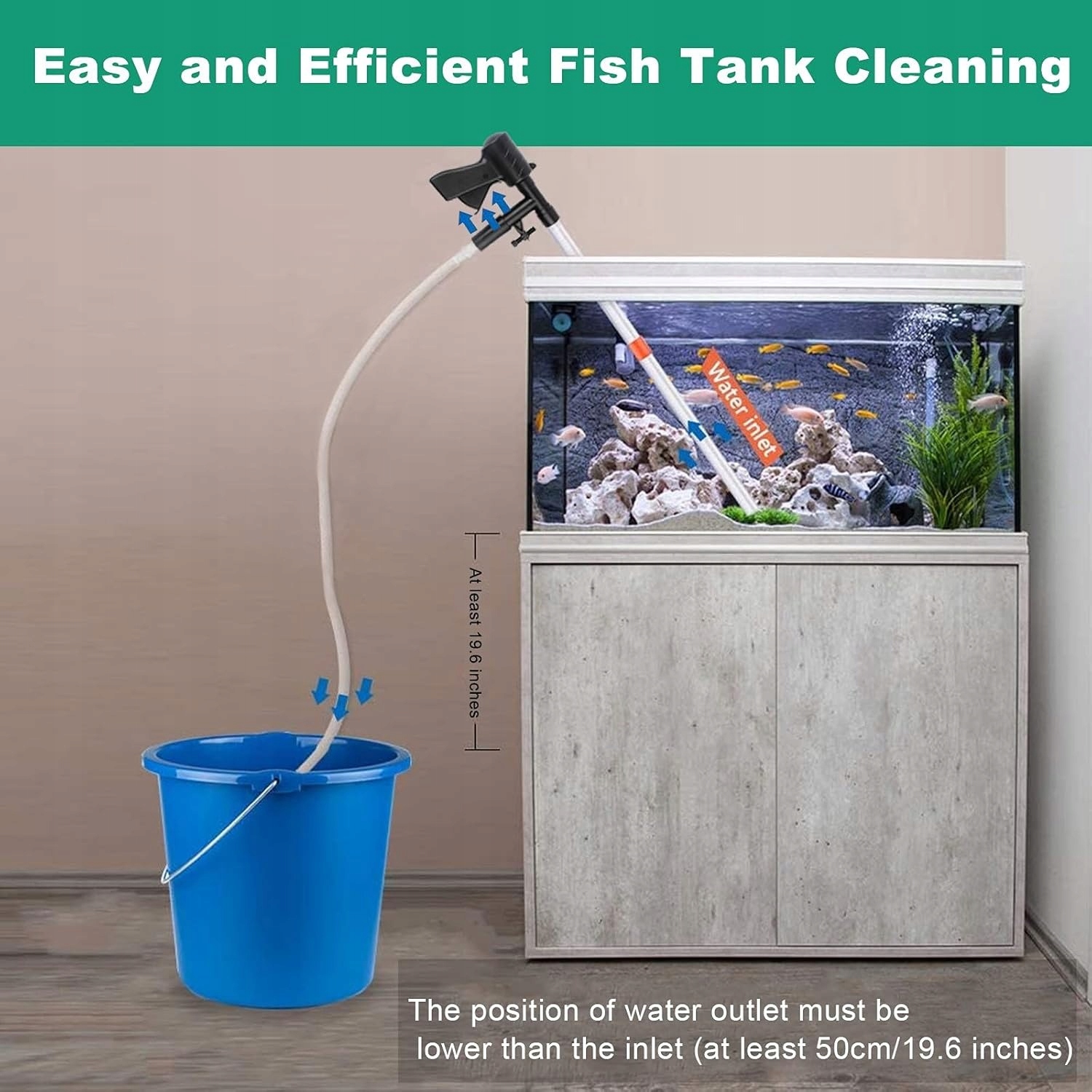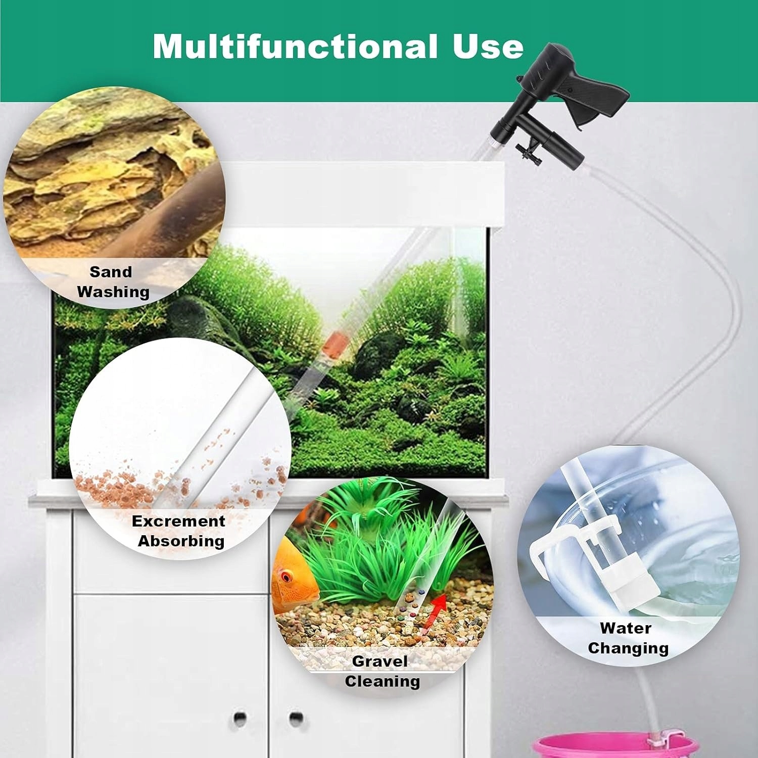 Нова конструкція безпеки: нова конструкція ручного преса, без електрики та безшумна робота. В інструментах для чищення акваріума використовується високоякісний стійкий до тиску повітряний мішок, міцний, надсильний тиск сифона може швидко витягнути каламутну воду з акваріума. Вакуумна трубка для акваріума має фільтруючу сітку, прикріплену до кошика фільтра, щоб блокувати засмічення, викликане всмоктуванням гравію, і водночас запобігає висмоктуванню ваших чудових рибок і маленького гравію з акваріума.
