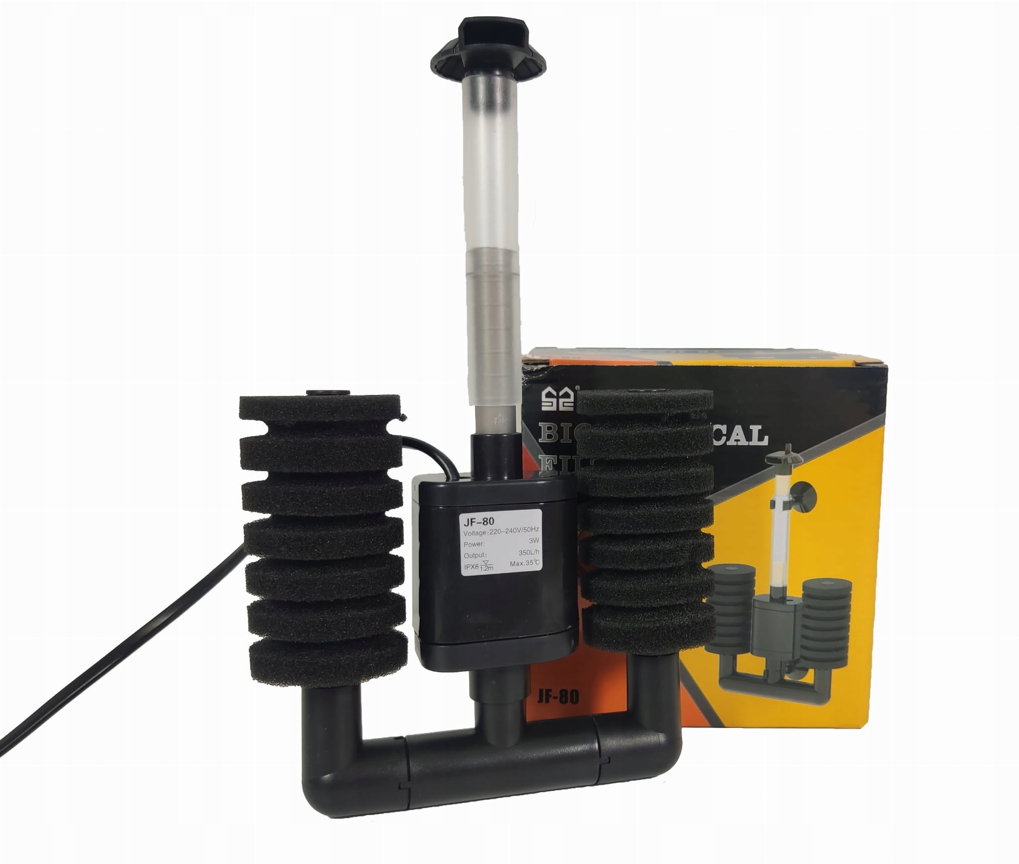 Внутрішній фільтр JF-80 оснащений двома фільтруючими губками, які забезпечують відмінне механічне очищення води. Фільтр характеризується високою ефективністю 350 л/год, з дуже низьким енергоспоживанням - всього 3 Вт.