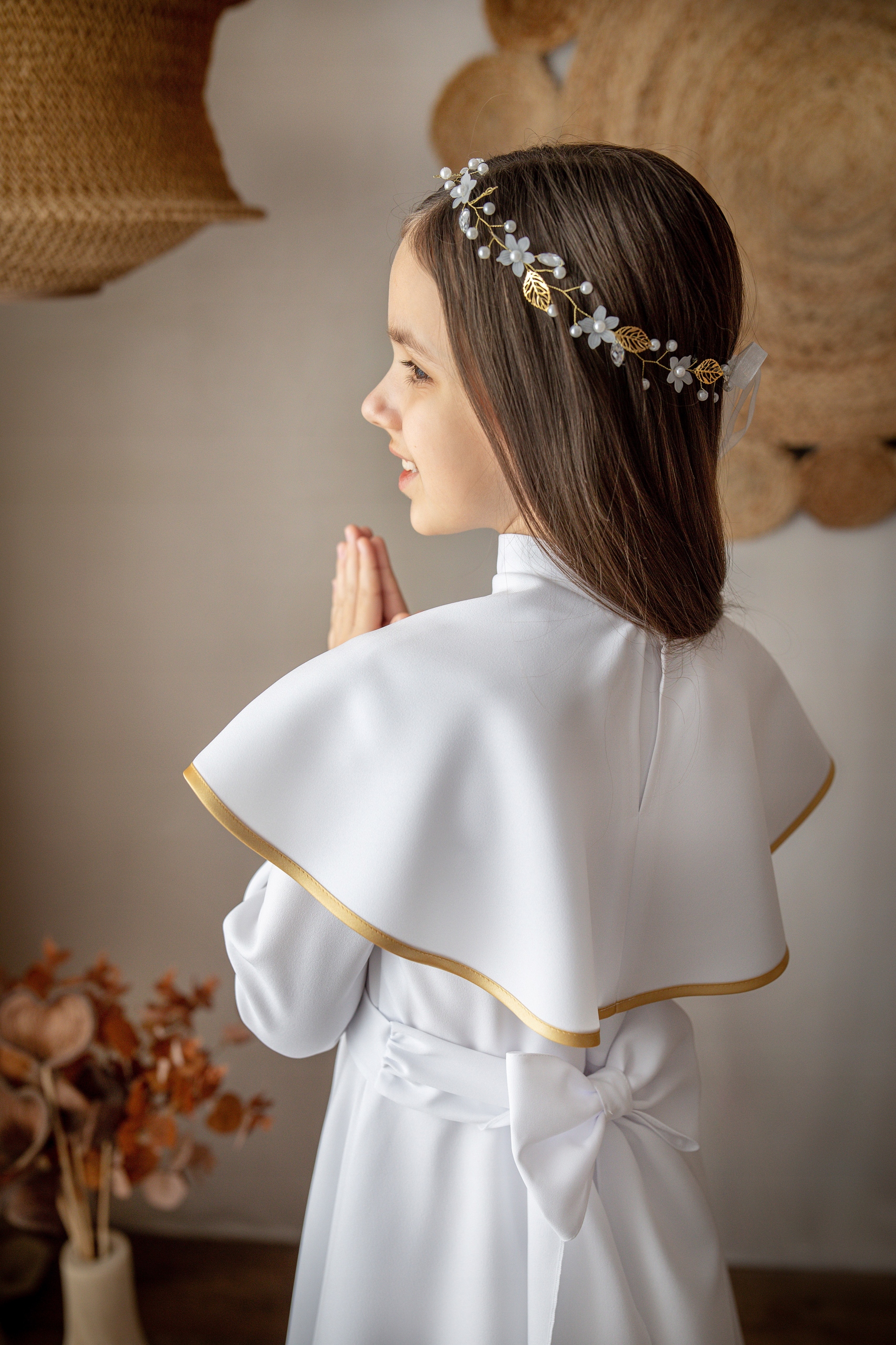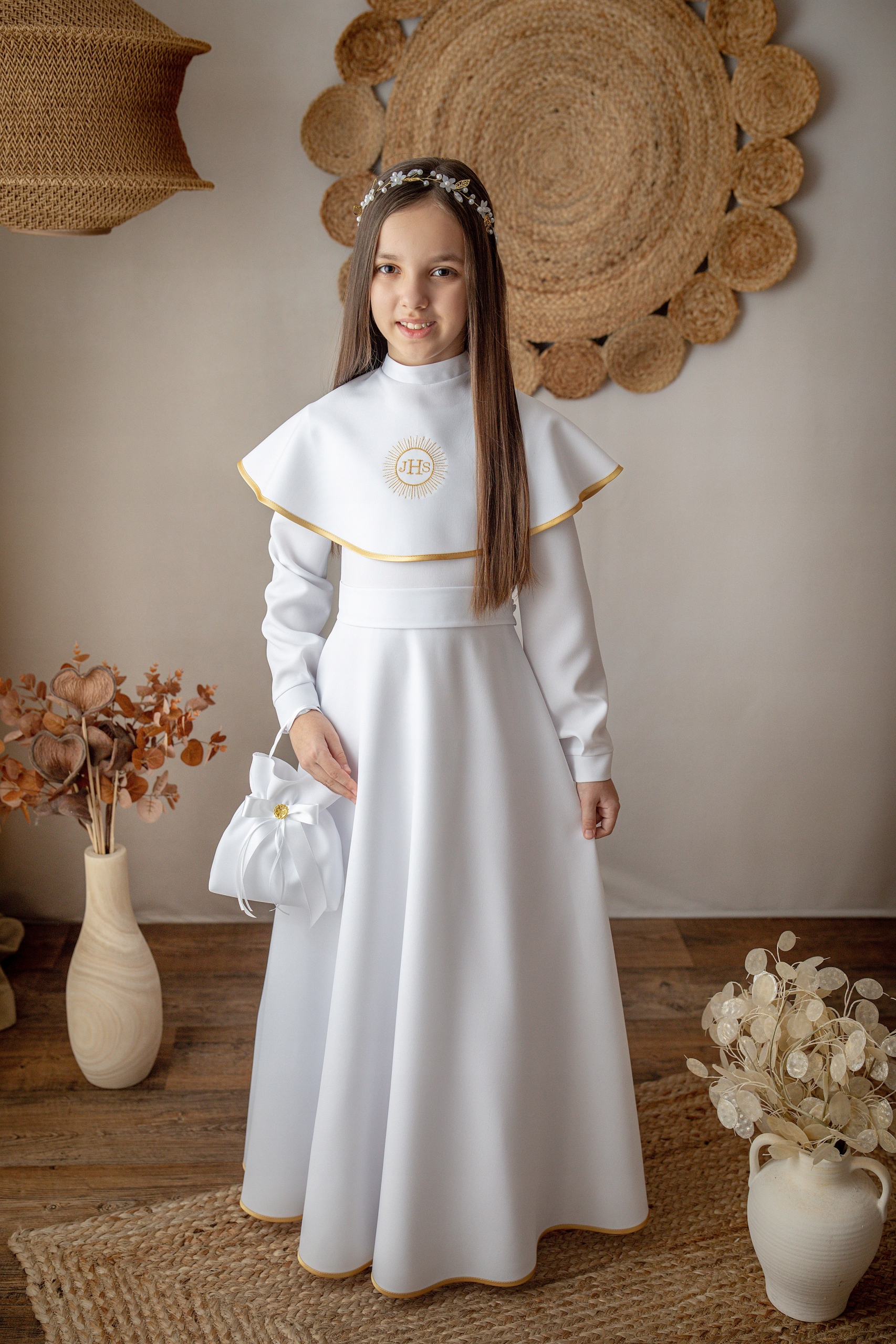 Альбом для причастя з довгим рукавом. Накидка оздоблена золотим кантом, золото IHS, ззаду застібається на гудзик. Регульований пояс з красивим бантом забезпечує точну посадку сукні на талії.