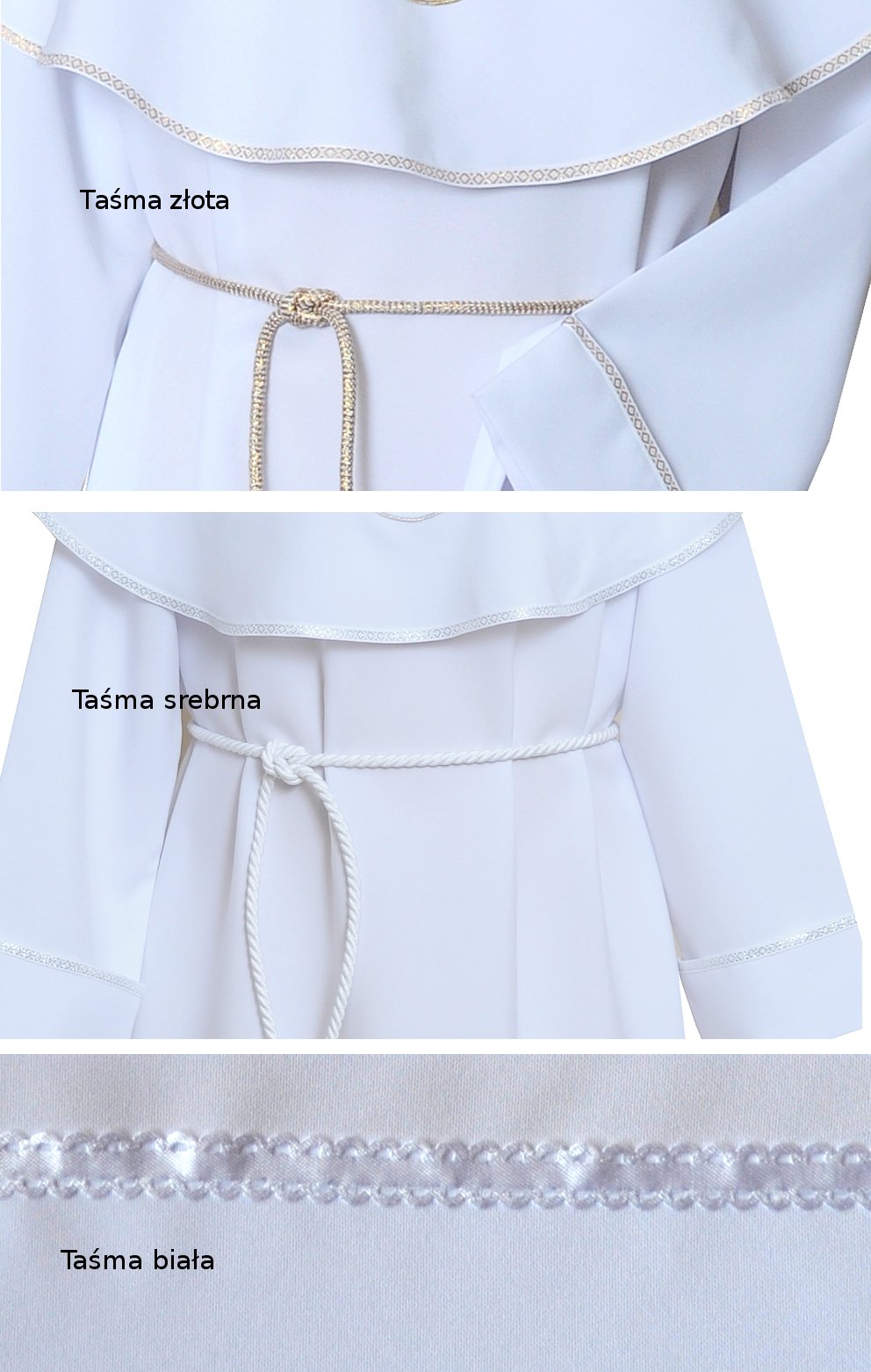 Альби оздобленілітургійною стрічкою золотом або сріблом, білим декоративним стрічка, білі або золоті квіти, ромашки