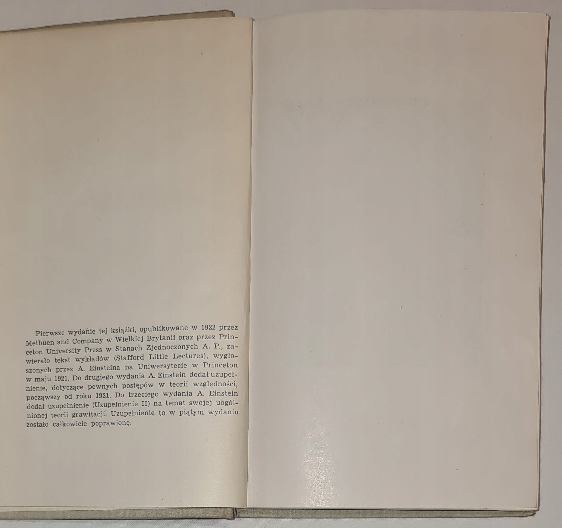 Перше видання цієї книги, опубліковане в 1922 році Methuen and Company у Великій Британії та Princeton University Press у Сполучених Штатах Америки A. P., містило текст лекцій (Stafford Little Lectures), прочитаних А. Ейнштейном у Прінстонському університеті в травні 1921 року. До другого видання Ейнштейн додав доповнення, яке стосується певних досягнень у теорії відносності, зроблених з 1921 року. До третього видання А. Ейнштейн додав доповнення (Додаток II) щодо своєї узагальненої теорії гравітації. Це додаток було повністю переглянуто в п’ятому виданні.