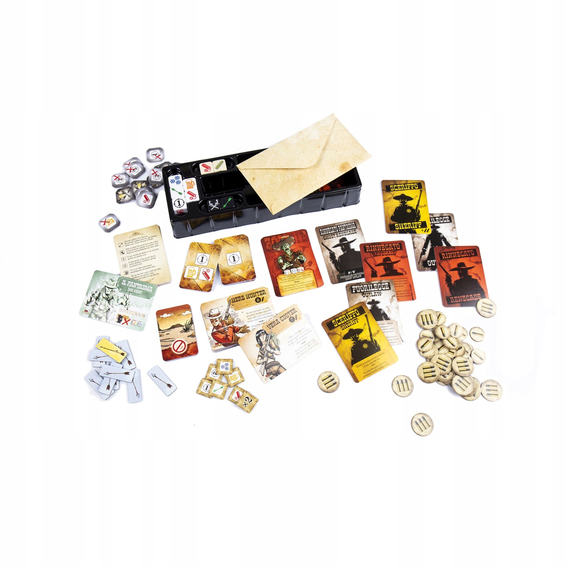 Complení sada kostkového Bangu! v onem originalálním balení. Найдете в ньому закладний гру Bang! Косткова гра, 2 розширені - Банг! - Старий седан бах! kostková hra - NEmrtví nebo živí a nakonec 4 zcela nové postavy. Ха Банг! Kostková exploze: 9 кубиків, 36 карток поставок, 18 карток ролей, 1 карта привидів, 29 маленьких частин, 17 частин přehledový, 3 частини rozdelovače, 10 частин, 44 карти, 7 žetonů ducha, 15 žetonů soubojových zranění, 3 списки правиделів, 3 чеських і словенських правидел. картки.