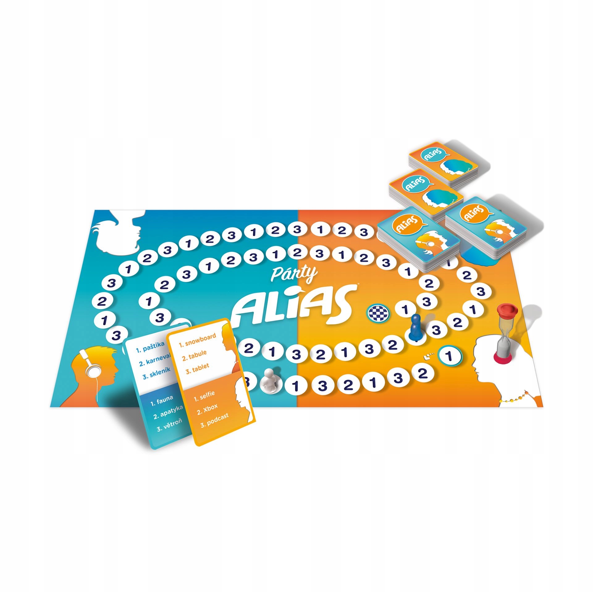 Párty Alias Souboj generací obsahuje: herní plan, 400 karet obsahujících 2 400 slov, přesýpací satiny, 2 figurki a pravidla.