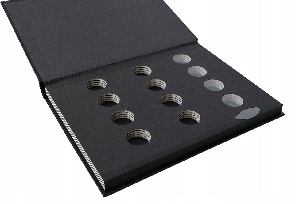 - Кожна картка має 12 отворів для монет діаметром 24 мм, розташованих у три ряди, обладнаних рухомими захисне скло.