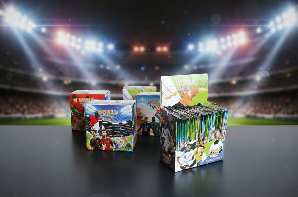 Набір для колекціонера футбольних карток: добротний альбом/клас + містка мега коробка. Альбом містить 432 картки (розкладка 9 кишень × 24 сторінки, обидві сторони). Фольга, прозорі кишені захищають і демонструють картки, а обкладинка з АБС забезпечує довговічність. Доступні 4 дизайни обкладинок, що стосуються футбольних зірок.