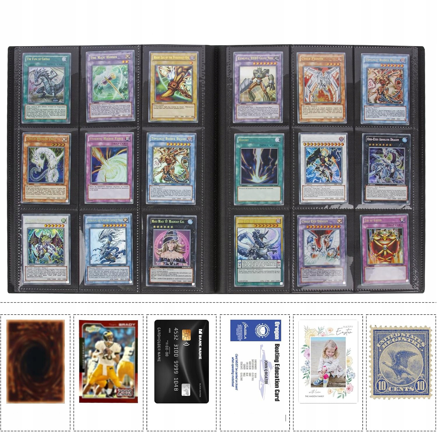 💳 [ВИСОКИЙ МАТЕРІАЛ ЯКІСТЬ]: чорна колекційна папка для карток із гумкою виготовлені з високоякісного матеріалу PP, який є водонепроникним і стійким до бруду, захищаючи карти від пошкоджень. Кожна сторона має легкий, м’який амортизуючий шар, який запобігає подряпинам і ударам на картках, зберігаючи їх у хорошому стані.