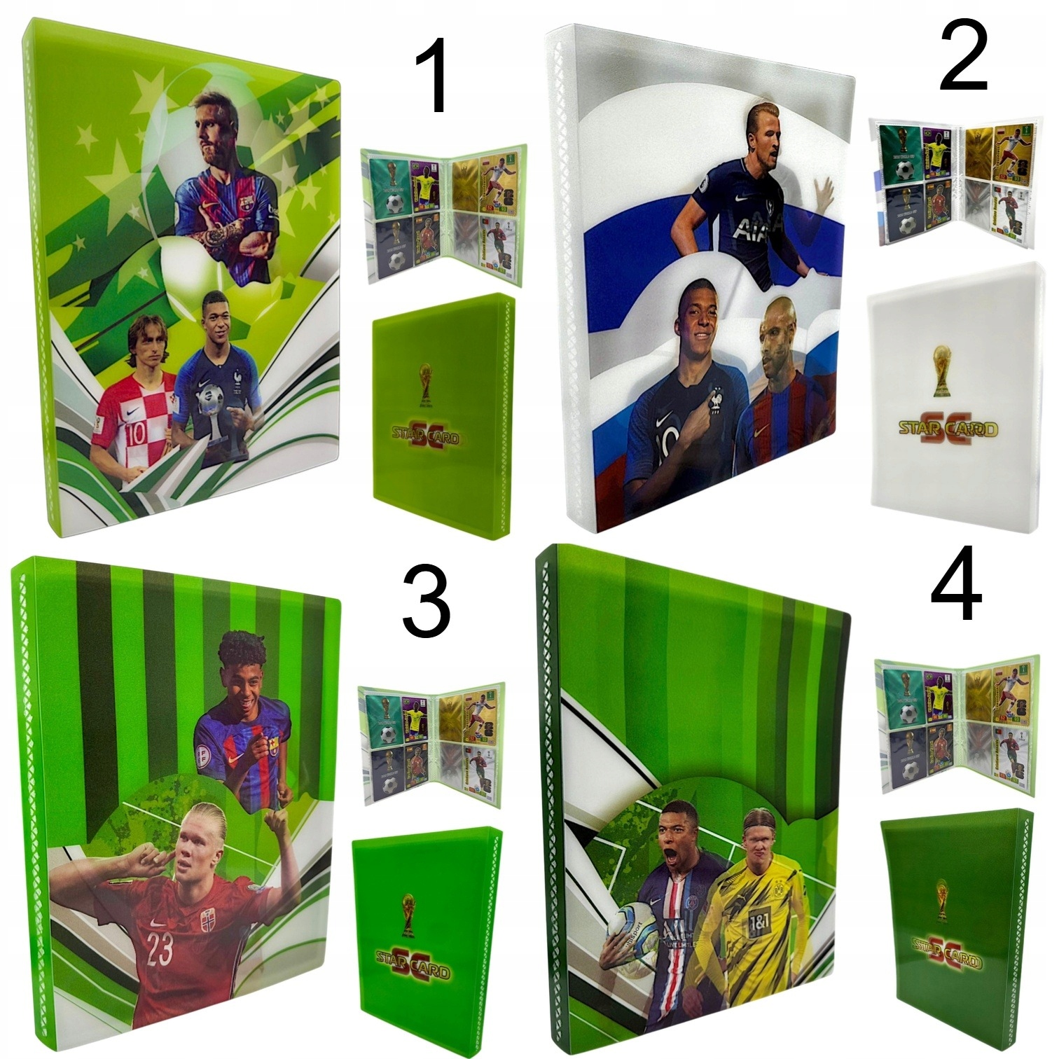 Повний набір для колекціонера: добротний альбом/клас місткістю 432 картки (9 кишень × 24 сторінки, картки видно з обох сторін) + 96 карт FIFA в упаковці. Обкладинка ABS жорстка та міцна, а прозорі кишені з фольги захищають картки та полегшують їх перегляд. Доступні 4 дизайни обкладинок, натхненні футбольними зірками.