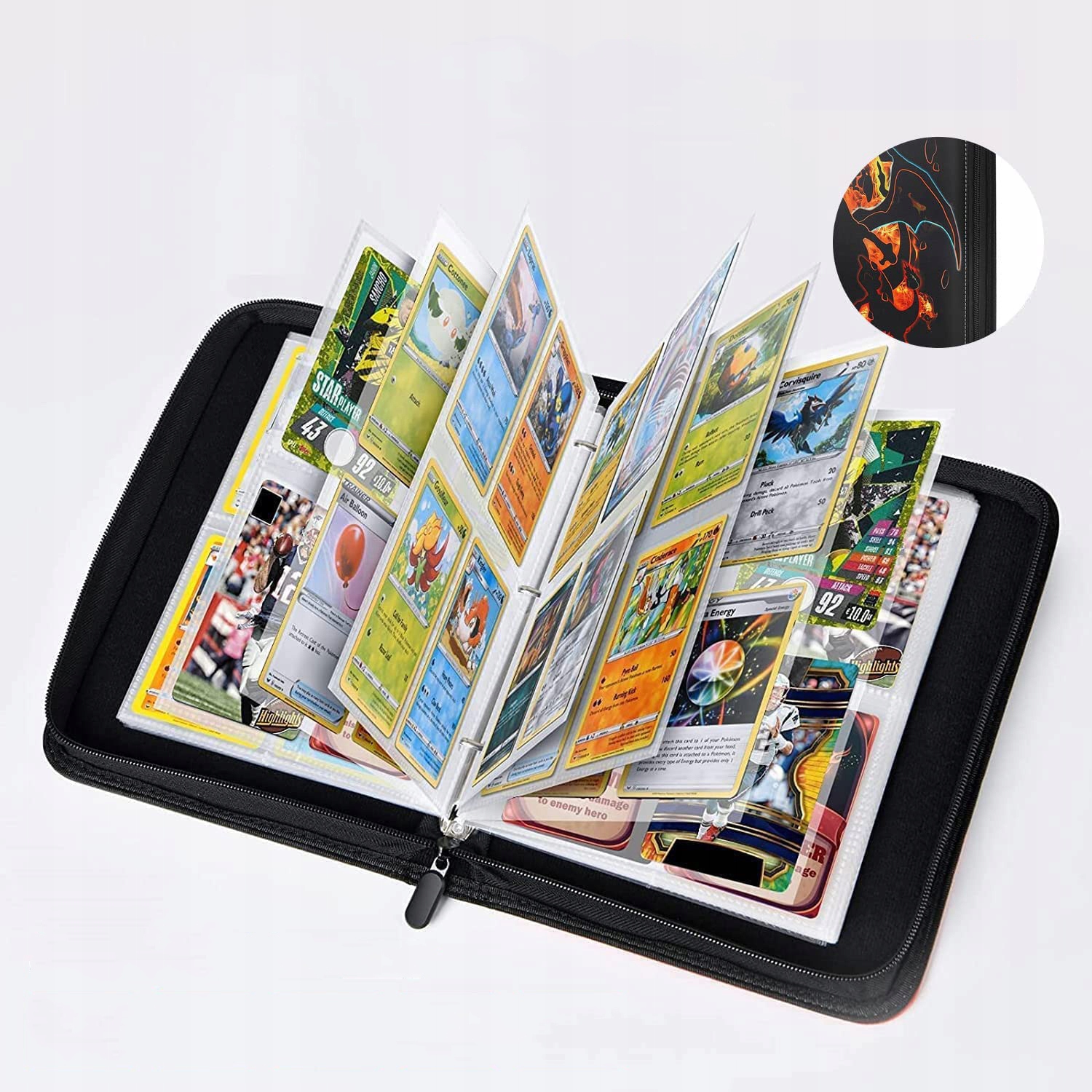 - ten album na karty kolekcjonerskie ma 4 kieszeni na stronę, a karty można przechowywać po obu stronach, w tym 50 wysokiej jakości wymiennych okładek, mieści łącznie 50 Kart Kolekcjonerskich do Gier.