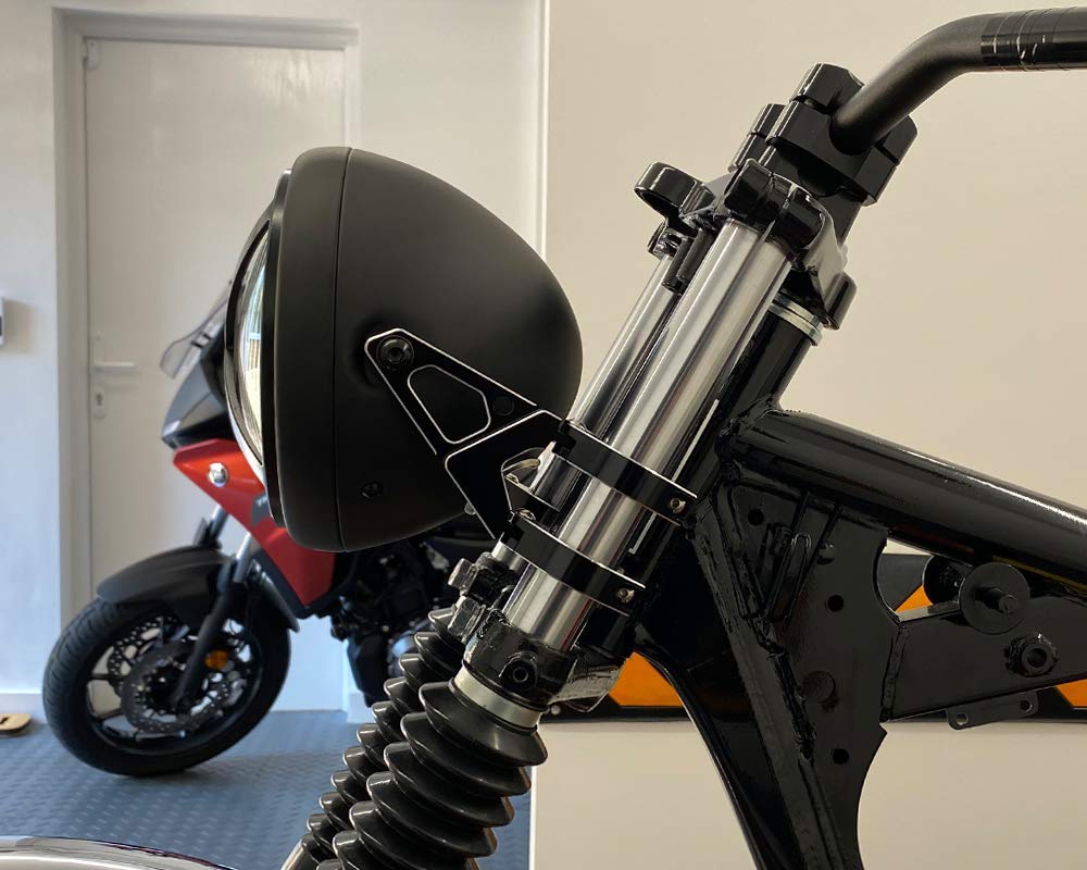 Фара мотоцикла 7,7" у класичному стилі cafe racer scrambler. Виготовлена з матової чорної сталі, ця фара чудово виготовлена та дуже міцна. Вона має функцію ближнього та дальнього світла, із герметичним пучком із міцною колбою. Діаметр фари 7,7" (190 мм) зі скляними лінзами та металевими вбудованими елементами, що забезпечує високу якість світла. Сумісність із широким вибором дизайнів мотоциклів.