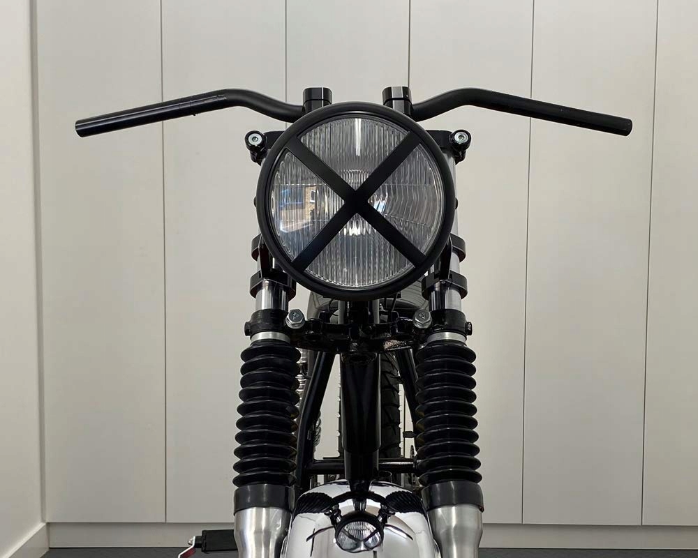 Мотоциклетна фара 7,7" з чорною матовою сталевою решіткою X-Rally 12 В 55 Вт, виготовлена на замовлення для проекту Cafe Racer Scrambler - ближнє / ближнє світло