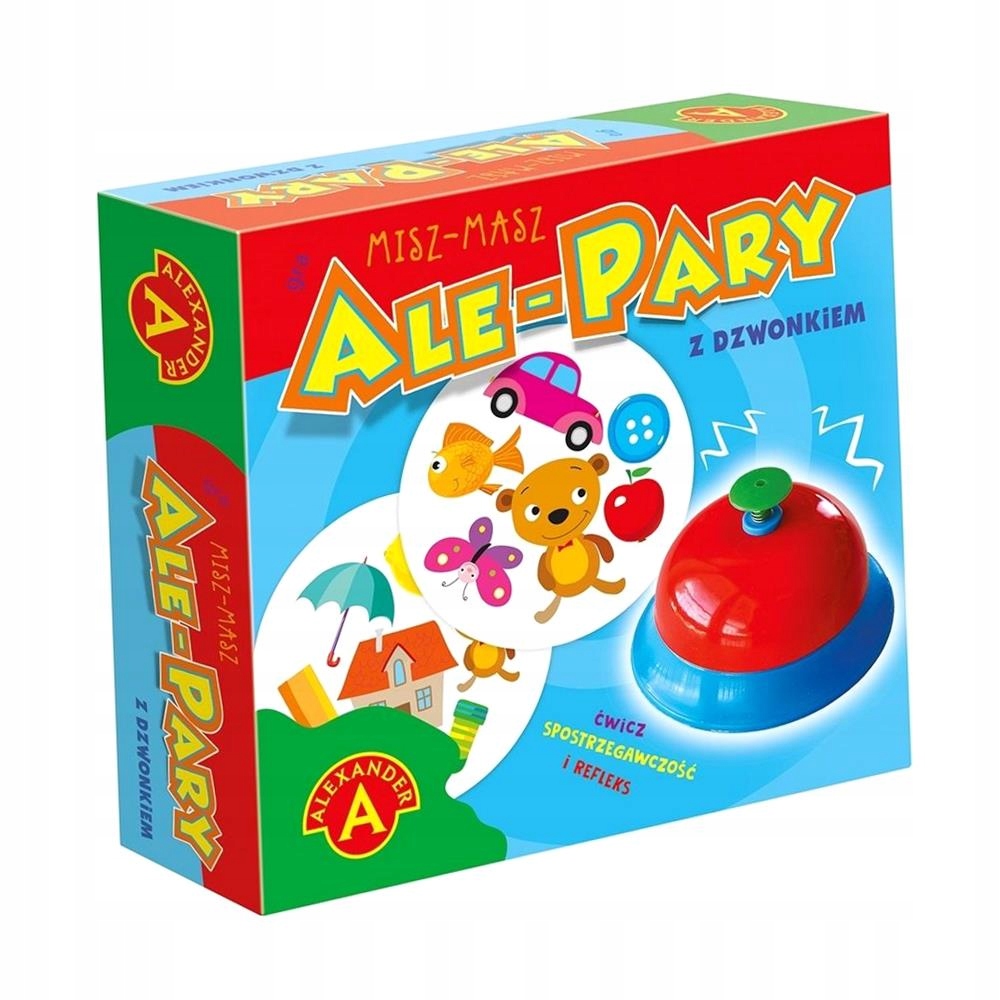Але Pairs with a Bell - MISZ MASZ - це божевільна гра-спостереження. Гра складається з 31 картки, на кожній з яких по 6 картинок. Будь-які дві картки мають одне спільне зображення (але часто різного розміру). Мета гри - якомога швидше знайти спільну картинку. Той, хто першим побачить загальне зображення на своїй картці та картці в центрі столу, дзвонить у дзвіночок і називає назву малюнка. Потім він кладе свою картку на вершину стопки. Гра чудово тренує зоровий аналіз, сприйняття, розрізнення деталей і рефлекси. Реквізит у вигляді дзвіночка, який люблять усі діти. Два варіанти веселощів.