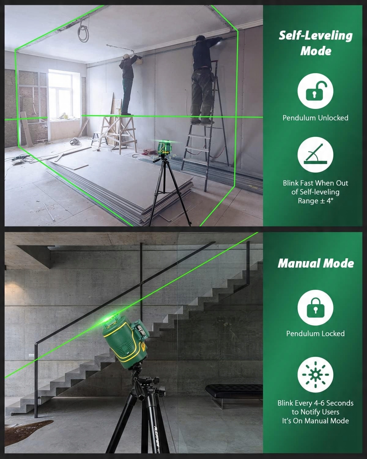 - Вимкніть та вручну режим + Висока точність самостійного рівня -оснащена інтелектуальною маятниковою системою, що дозволяє автоматичним рівнем самостійного рівня та сигналізацією рівня, що перевищує. Автоматичне вирівнювання на похилих поверхнях у діапазоні 4 °. Якщо поверхня буде нахилена вище 4 °, лазер спалахне, що сигналізує про рівень рівня; Ручний режим - дозволяє користувачеві блокувати перехресну лінію, після блокування маятника, він блокує лінію для використання під будь -яким кутом. Лазерний рівень характеризується високою точністю ± 1/9 дюймів з відстані 33 -фути