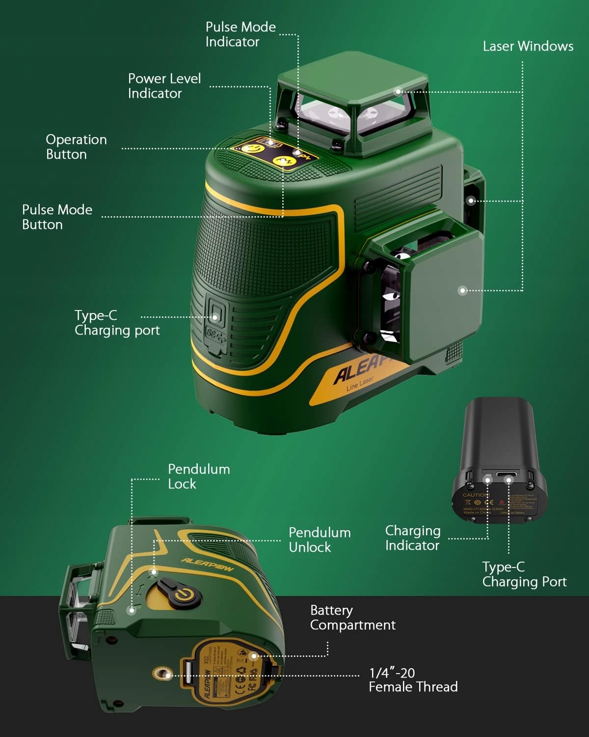 Лазерний рівень ALEAPOW 3D, рівень 3х360 ° Зелений лазер з довжиною 147 футів, 5,2 ах акумулятор, Cop Creather, самостійне, ручне та імпульсне режим, обертова магнітна основа, допоміжний кронштейн, транспортний валізу - x12