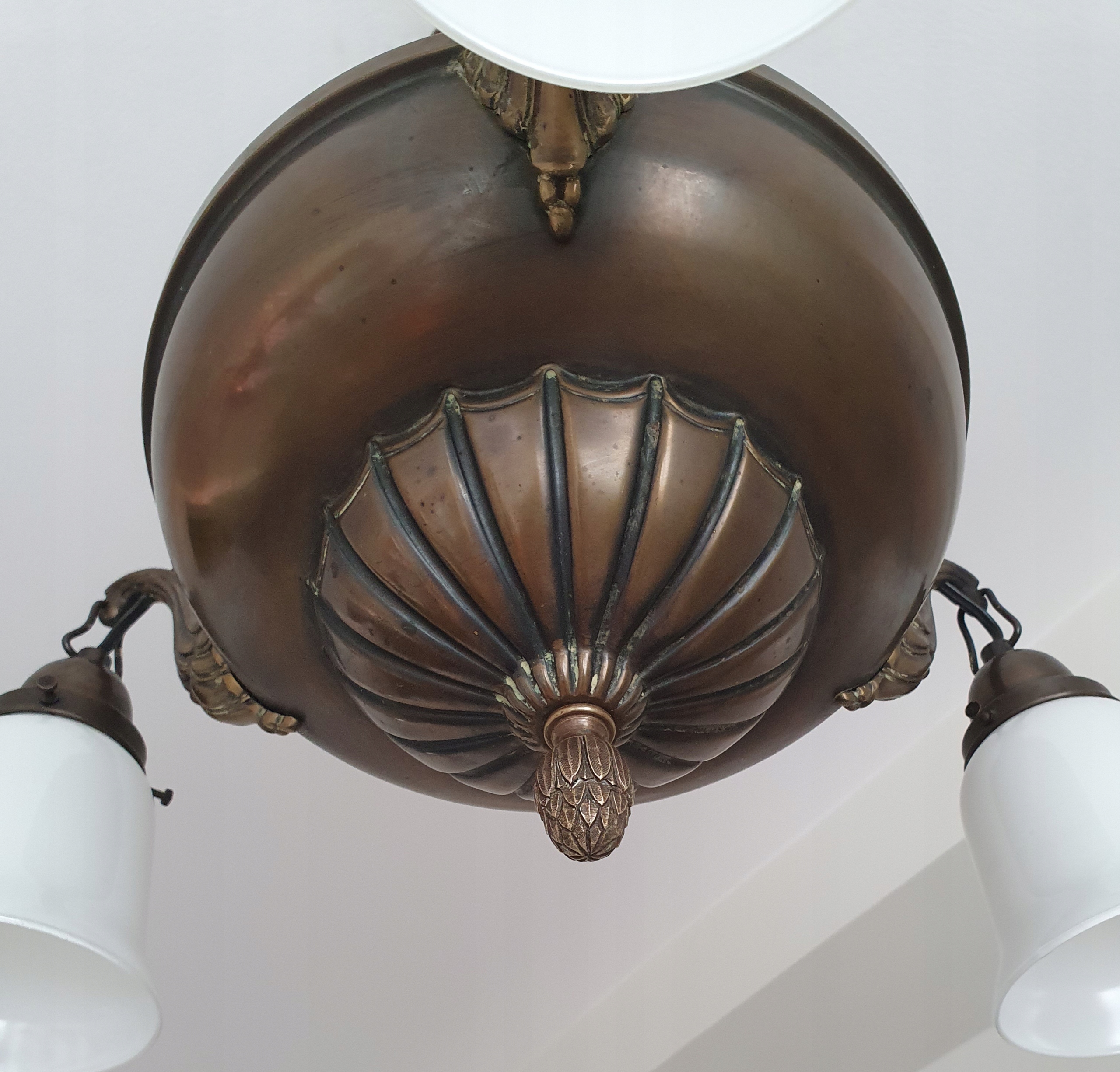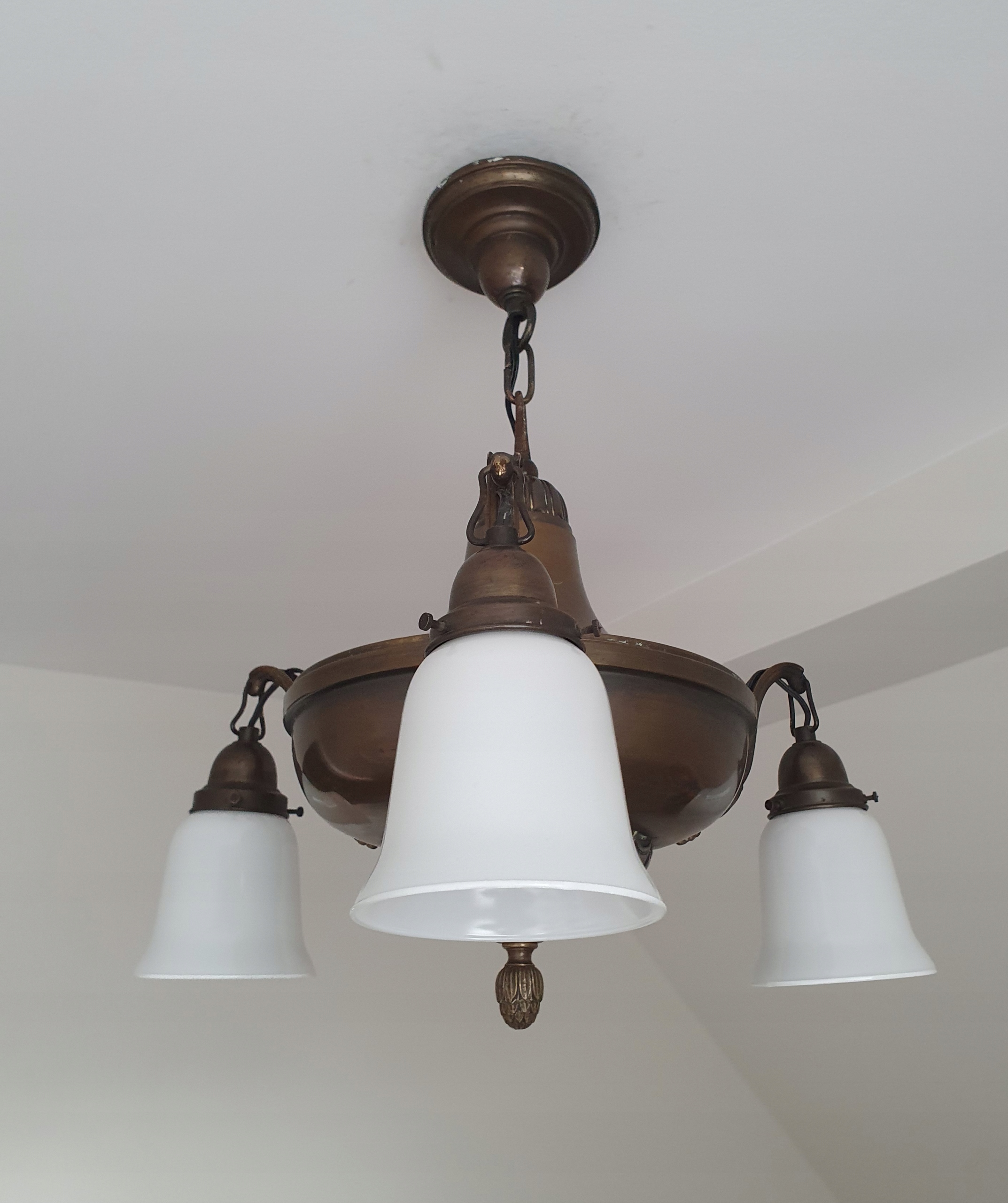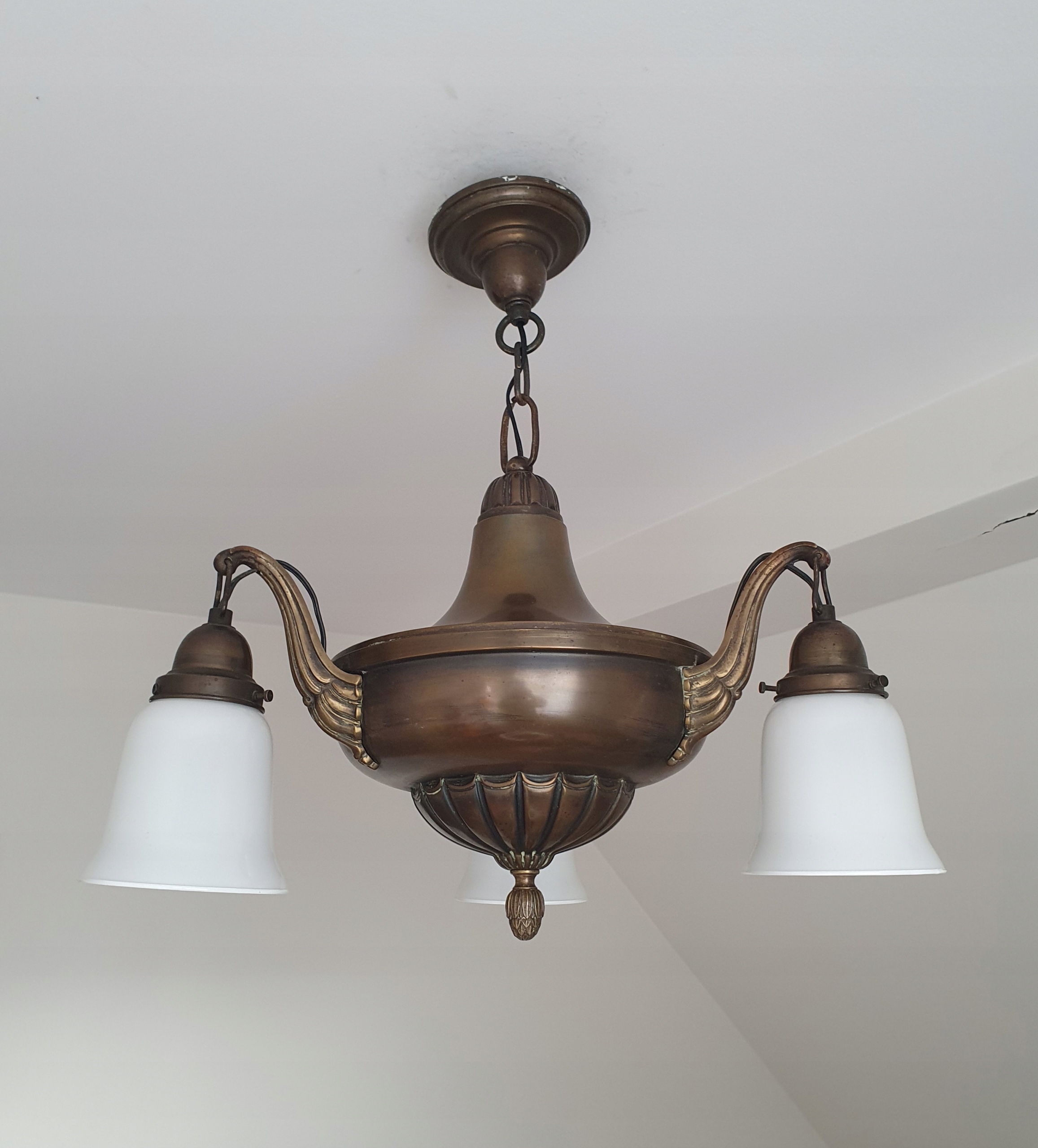Люстра виготовлена з масивної патинованої латуні та має елегантні історичні форми з елементами декору в стилі початку 20 століття. Три рамена, спрямовані донизу, мають абажури з білого скла, які забезпечують тепле, приємне світло.