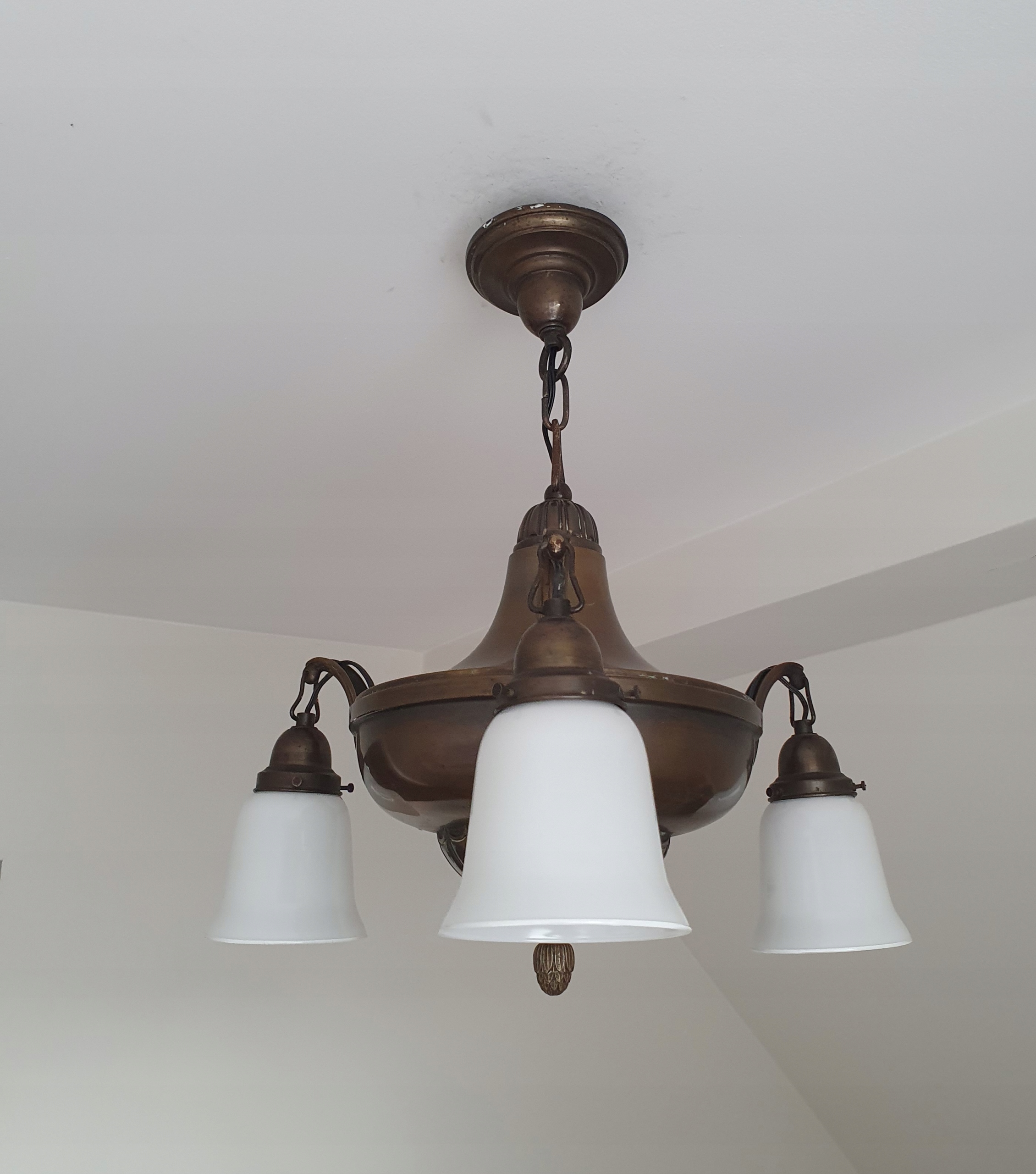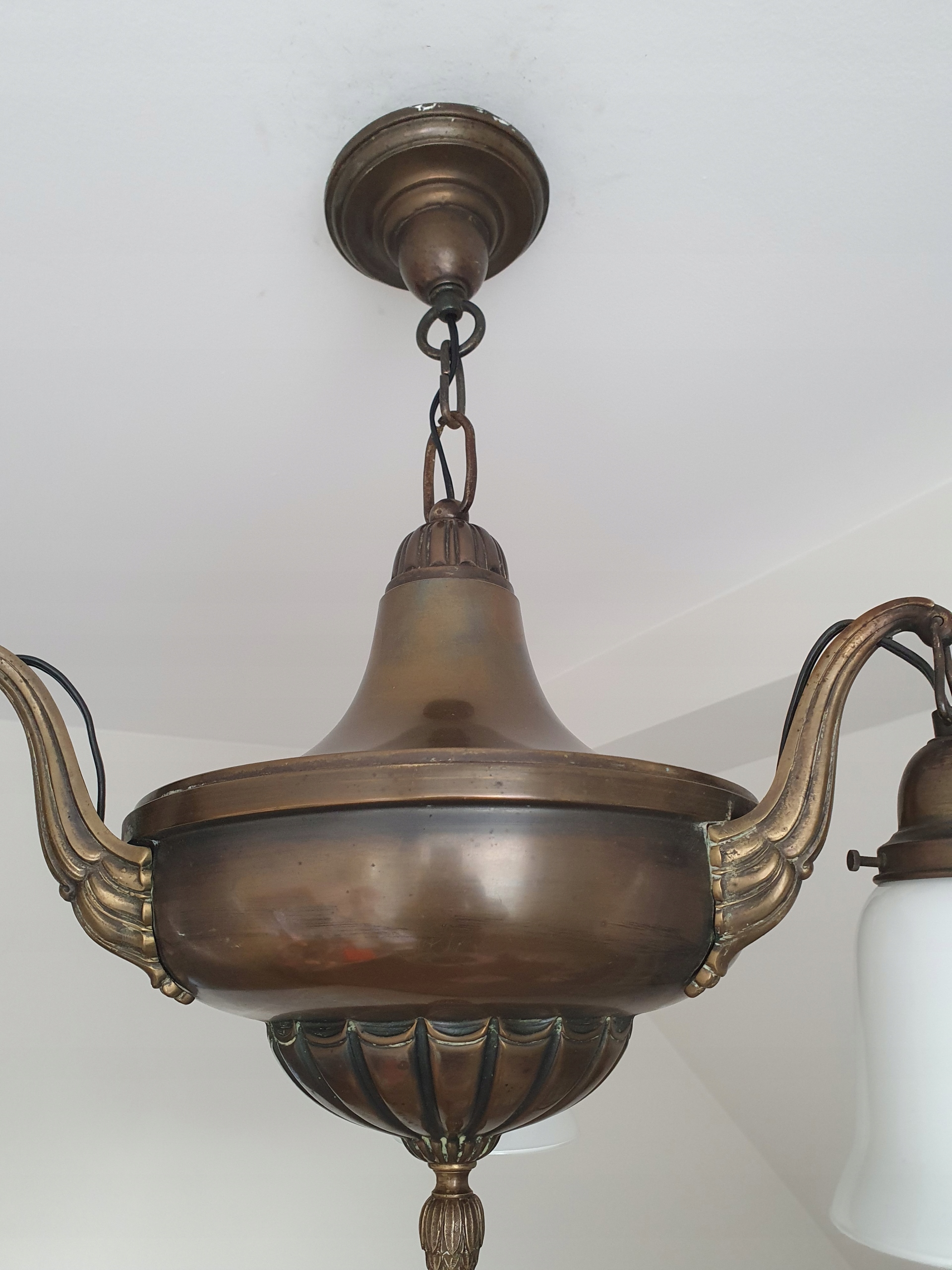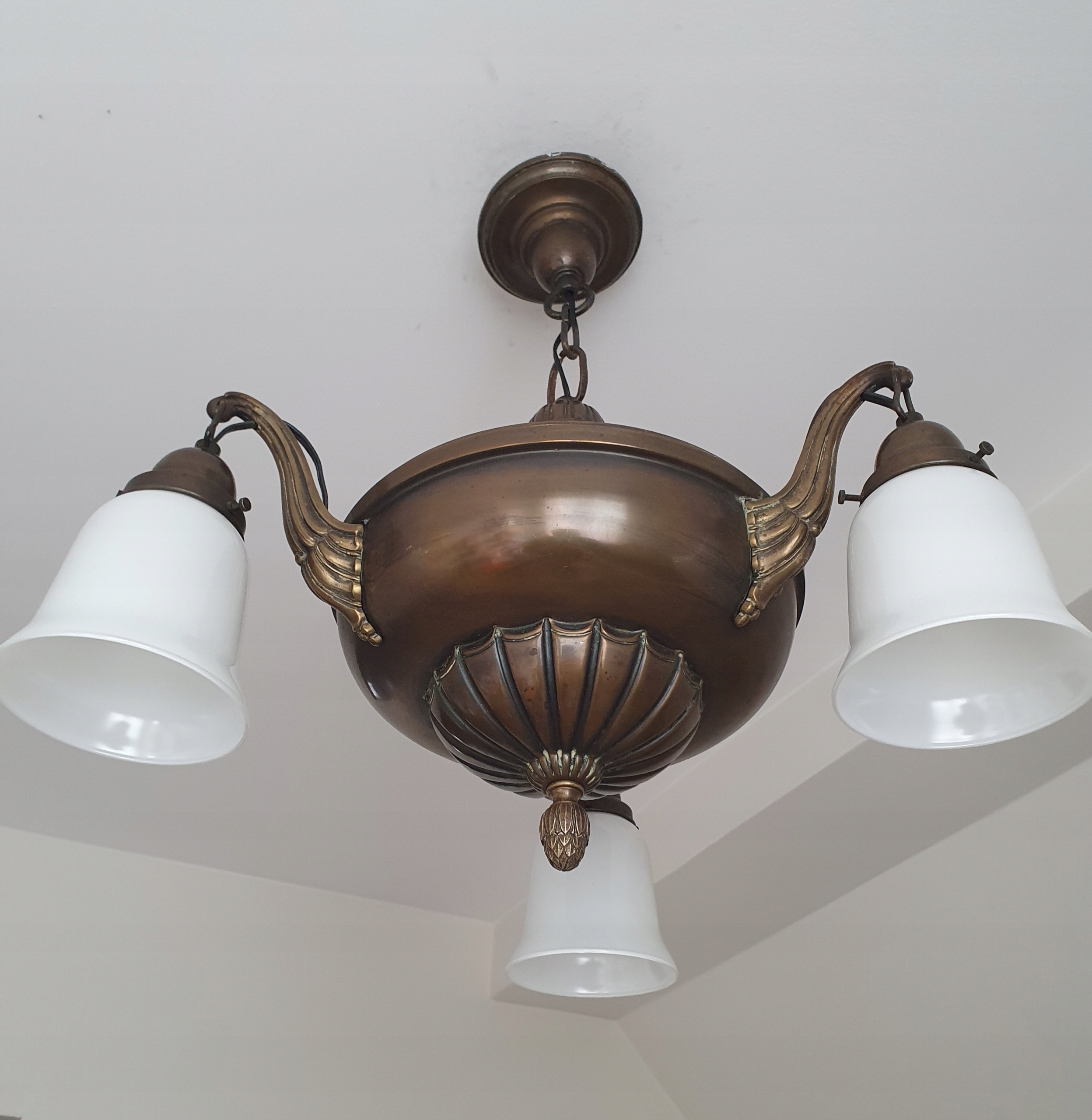 Люстра виготовлена з масивної патинованої латуні та має елегантні історичні форми з елементами декору в стилі початку 20 століття. Три рамена, спрямовані донизу, мають абажури з білого скла, які забезпечують тепле, приємне світло.