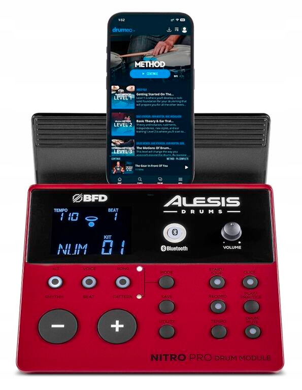 З Alesis Nitro Pro ви можете легко підключатися до своїх улюблених пісень або уроків через Bluetooth або вхід AUX. Незалежно від того, чи хочете ви грати разом або записувати, цей набір забезпечить вам плавну та бездротову співпрацю з мобільними пристроями. А завдяки вбудованому тримачу телефону ви завжди матимете свою техніку під рукою, не плутаючись із кабелями та адаптерами.