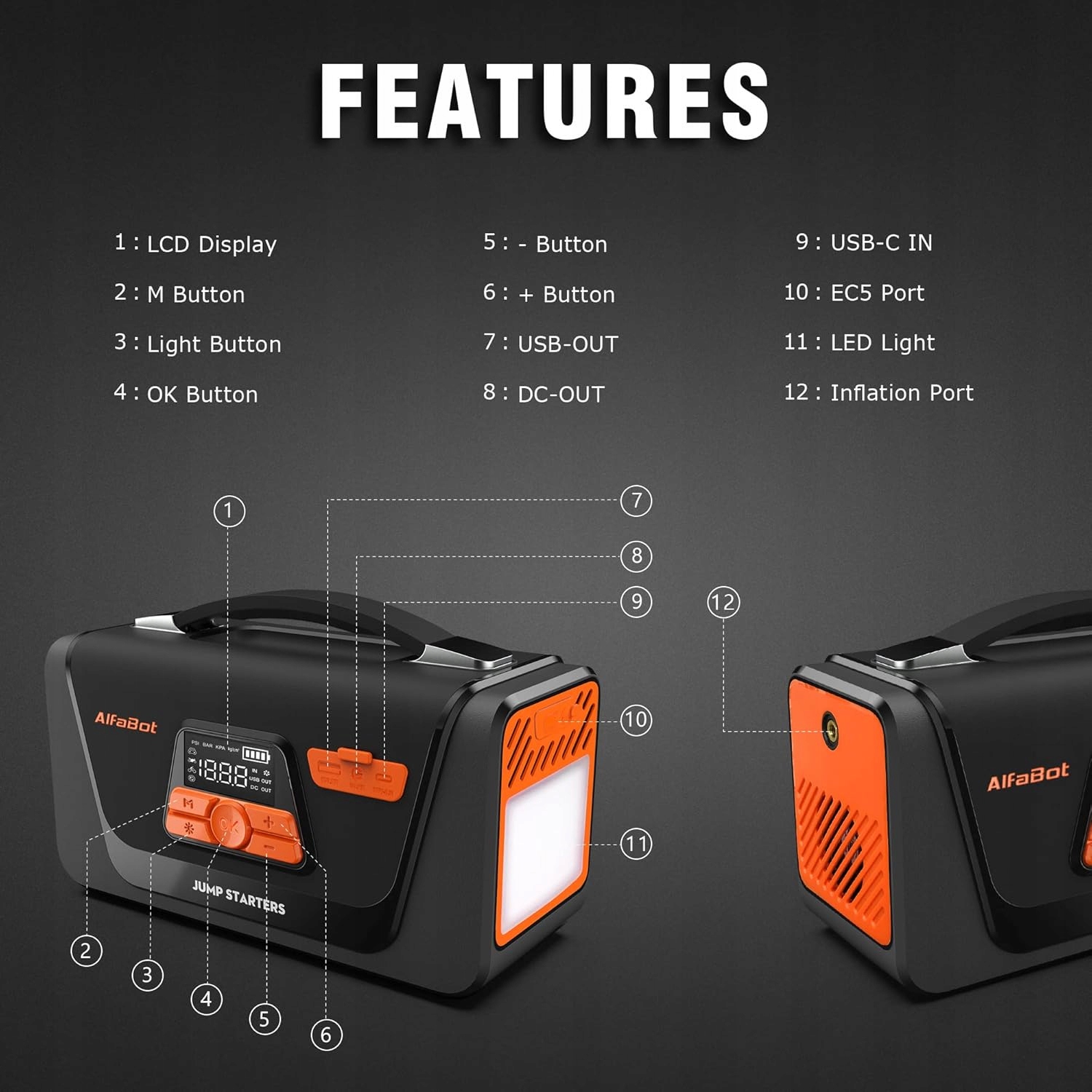 AlfaBot Q4 – ваш надійний стартер на 4000 А з повітряним компресором, світлодіодним підсвічуванням і кабелем для полегшення запуску. Потужність, безпека та впевненість у кожній подорожі!