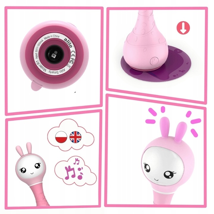 Зайчик Аліло розпізнає 9 різних кольорів польською та англійською. У набір входять картки з різними кольорами та зображеннями (тварин, предметів). Помістивши зайчика на дану картку, він розпізнає колір, зображений на ній, і те, що на ній розміщено, наприклад, кларнет, півень. Крім того, ми можемо поставити зайчика проти будь-якого предмета, колір якого він також розпізнає. Крім того, вуха зайчика світяться вгаданим кольором.
