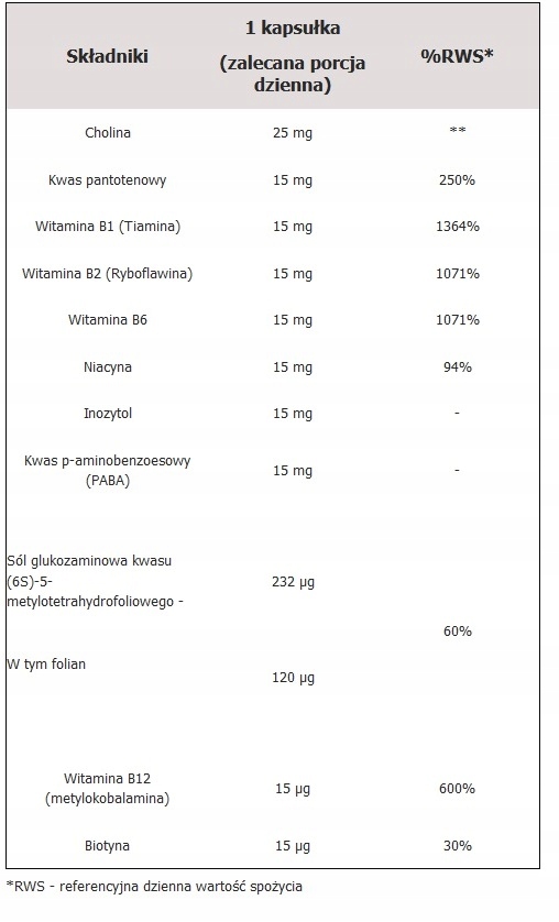 Холін, пантотенова кислота (кальцію D-пантотенат), тіамін (тіаміну гідрохлорид), вітамін B2 (рибофлавін), вітамін B6 (піридоксаль-5-фосфат), ніацин (нікотинова кислота), інозит, п-амінобензойна кислота (PABA ), наповнювач (мікрокристалічна целюлоза), фолат (глюкозамінова сіль (6S)-5-метилтетрагідрофолієвої кислоти), вітамін B12 (метилкобаламін), біотин (D-біотин), глазуруюча речовина: гідроксипропілметилцелюлоза.