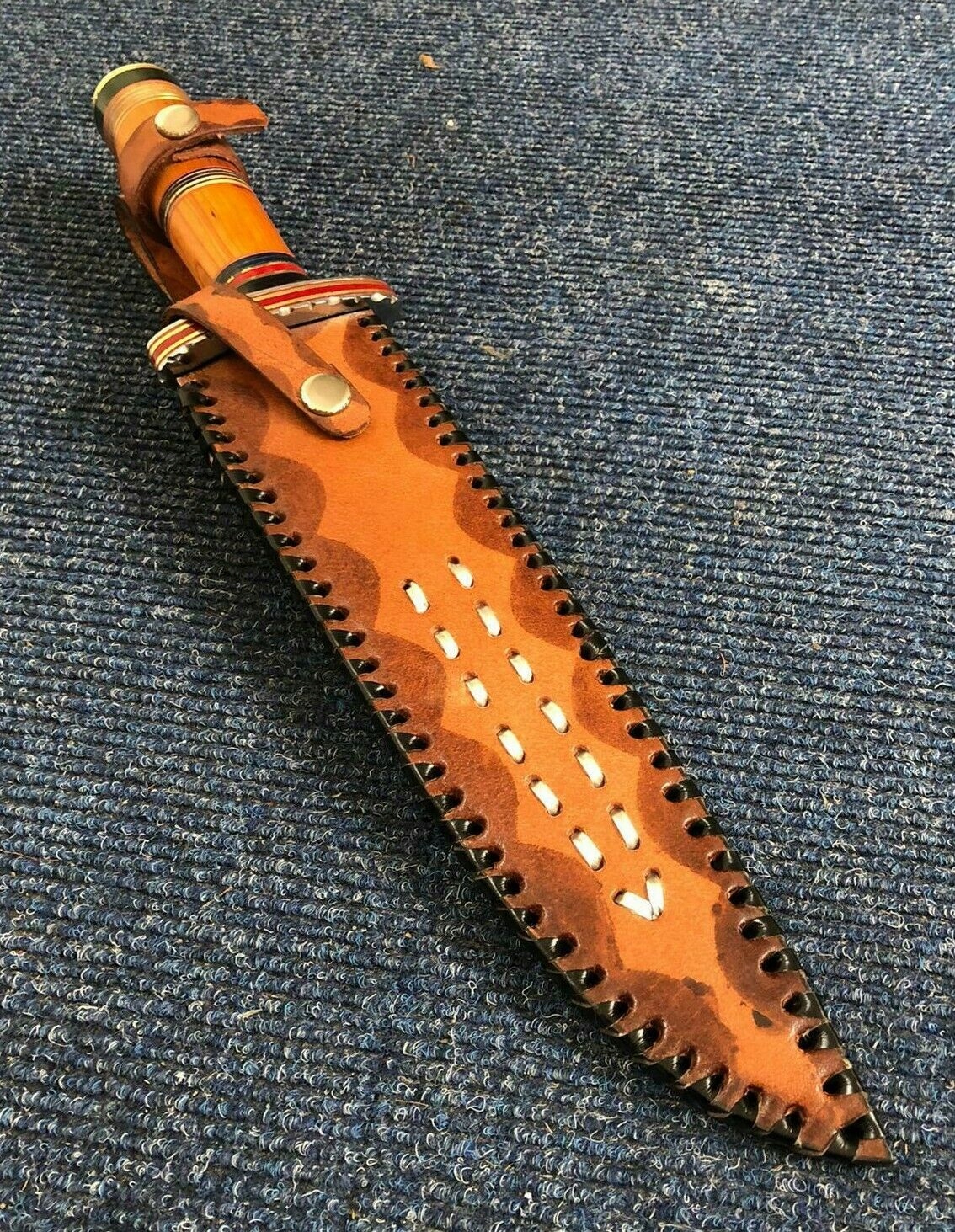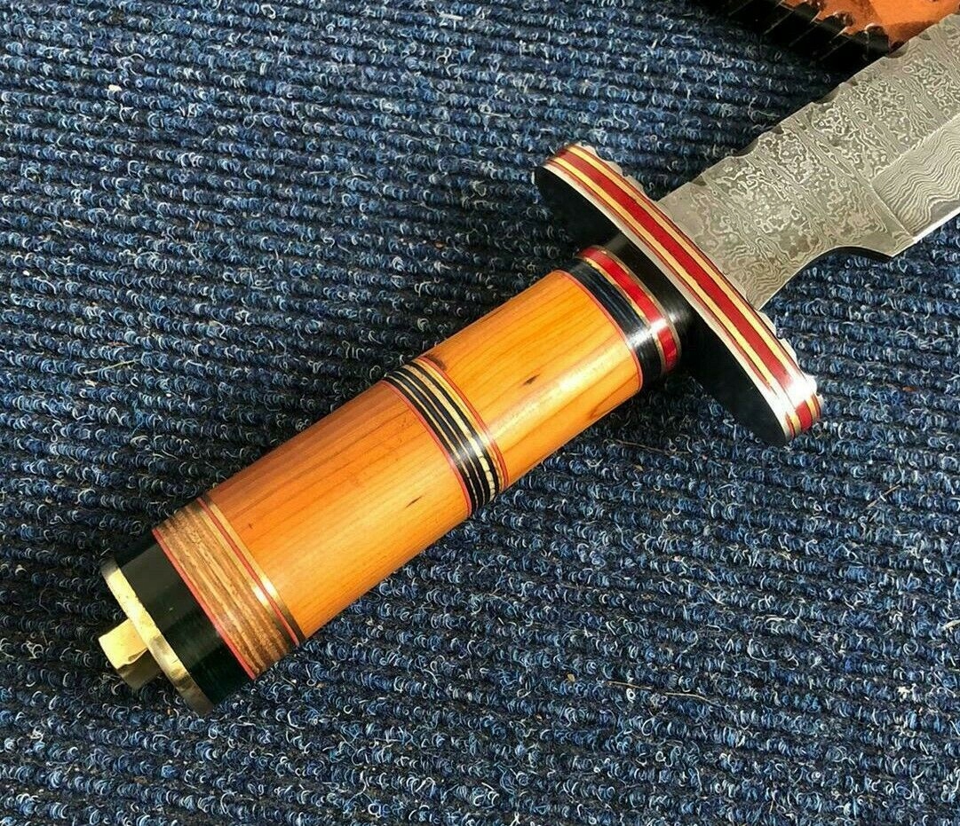 Це великий ніж Боуі, лезо виготовлене з дамаської сталі. Чудово підходить як мисливський ніж, туристичний ніж, ніж для виживання, мачете або тактичний ніж тощо.