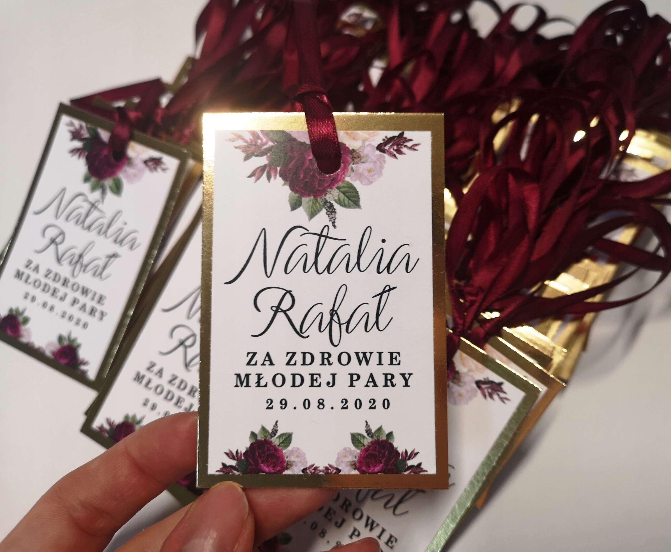 Елегантні підвіски на алкоголь. Золоті етикетки з колекції glamour з квітами (піони, гортензії, верес, соняшники, листя, море, троянди: білі, бордові, сині, зелені, різнокольорові, рожеві)