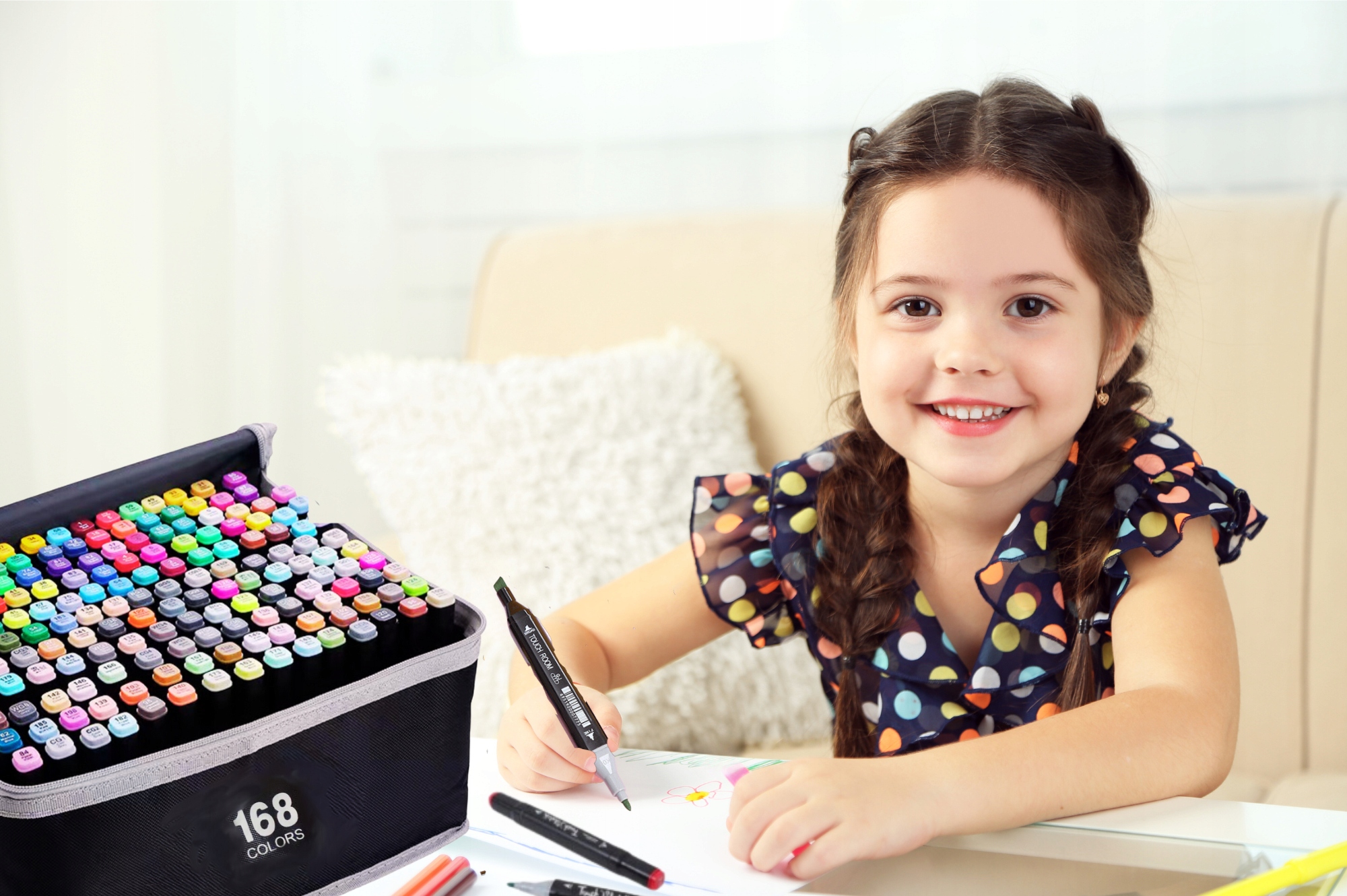 Набір із 168 маркерів, упакованих у зручну сумку для транспортування, — ідеальне рішення для тих, хто завжди в дорозі! Завдяки цьому ви не тільки візьмете улюблені фломастери з собою, куди завгодно, але й підтримуватимете ідеальний порядок, без зайвої метушні та пошуків потрібних кольорів.