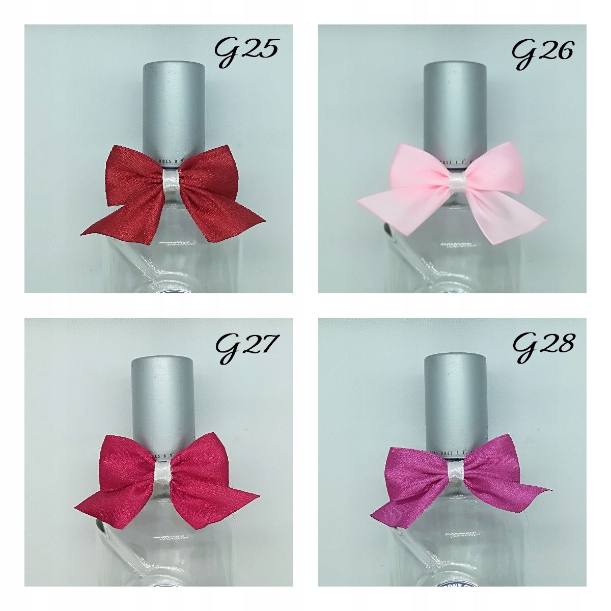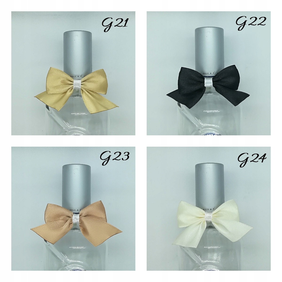 Банти виготовлені зі стрічки шириною 2,5 см, їх розмір приблизно 6 см. Завдяки гумці бантики підходять до будь-якої пляшки. Луки захищені від потертості.