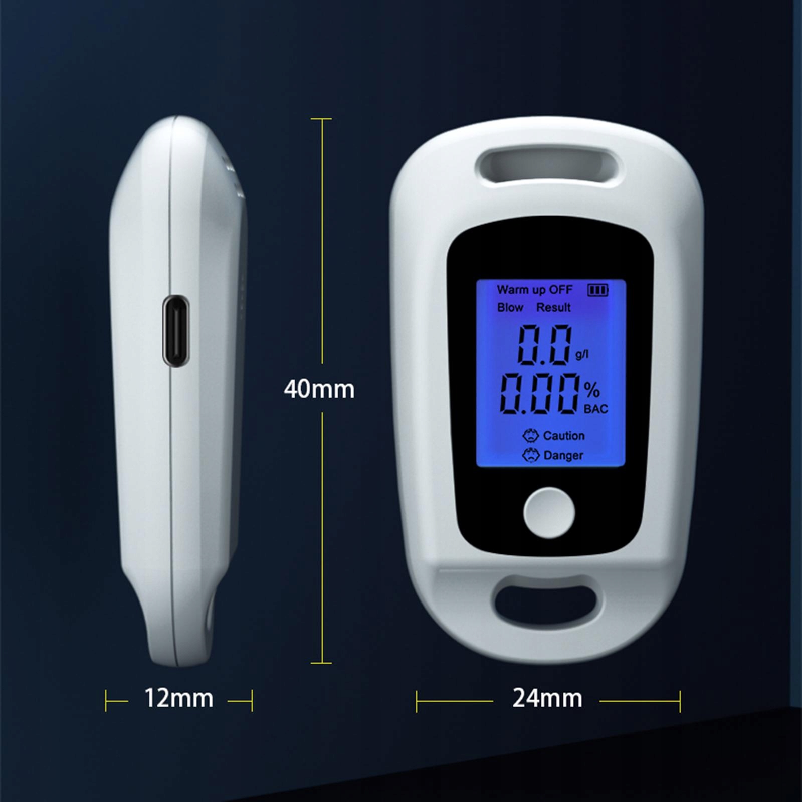 Пакет включає: 1 шт. алкоголь-тестер, 1 шт. кабель для заряджання. Примітка. Допустіть невеликі похибки через ручне вимірювання та різні монітори.