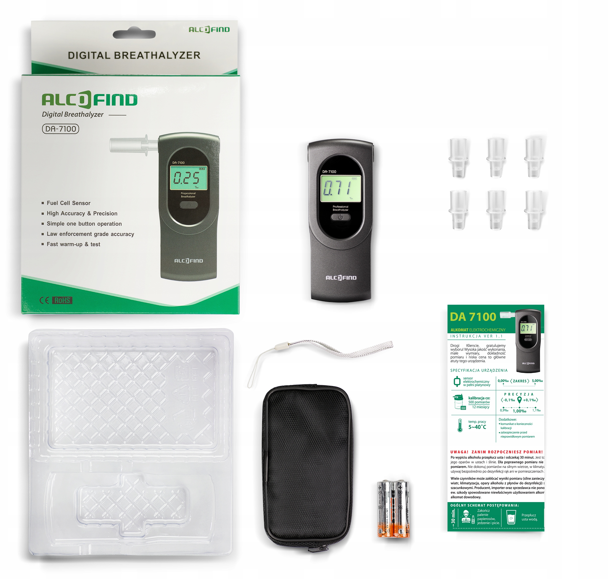 Просматривая «Алкотестер ALCOFIND DA-7100 + Мундштуки Приклад», вы можете быть уверены, что данный товар из каталога «Алкотестеры» будет доставлен из Польши и проверен на целостность. В цене товара, указанной на сайте, учтена доставка из Польши. Внимание!!! Товары для Евросоюза, согласно законодательству стран Евросоюза, могут отличаться упаковкой или наполнением.