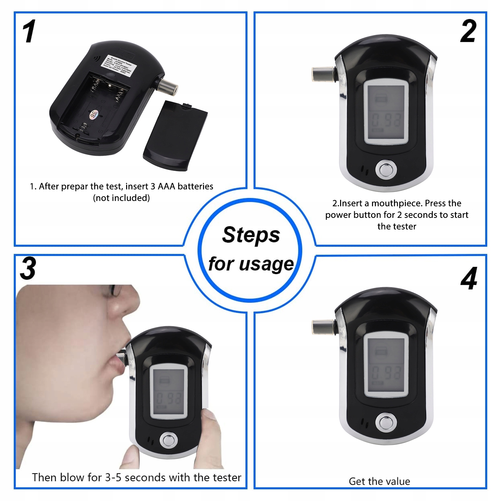 1, ПРОСТО У ЕКСПЛУАТАЦІЇ: встановіть батарею (не входить у комплект), увімкніть кнопку живлення тестера, зачекайте 15 секунд для попереднього нагрівання, а потім рівно дуйте протягом 3-5 секунд. 2、ВИСОКА ТОЧНІСТЬ: цей алкотестер використовує високоточні твердотільні датчики для контролю вмісту, щоб гарантувати, що ви можете керувати відповідально. 3. ДІАПАЗОН ВИМІРЮВАННЯ: Діапазон вимірювання становить 0,00-0,20% BAC і не буде жодного збільшення, коли результат тесту досягне максимального значення (0,20% BAC). 4. Світлодіодний індикатор: коли значення BAC падає нижче 0,05%, засвітиться зелений світлодіод і видасть 3 коротких звукових сигналу. Коли значення BAC перевищує 0,05%, загоряється червоний світлодіод і ви чуєте 3 довгі звукові сигнали. 5、З 5 насадками: цей набір постачається з 5 змінними насадками, тож ви можете легко використовувати його будь-де та будь-коли, підходить для індивідуального чи професійного використання.