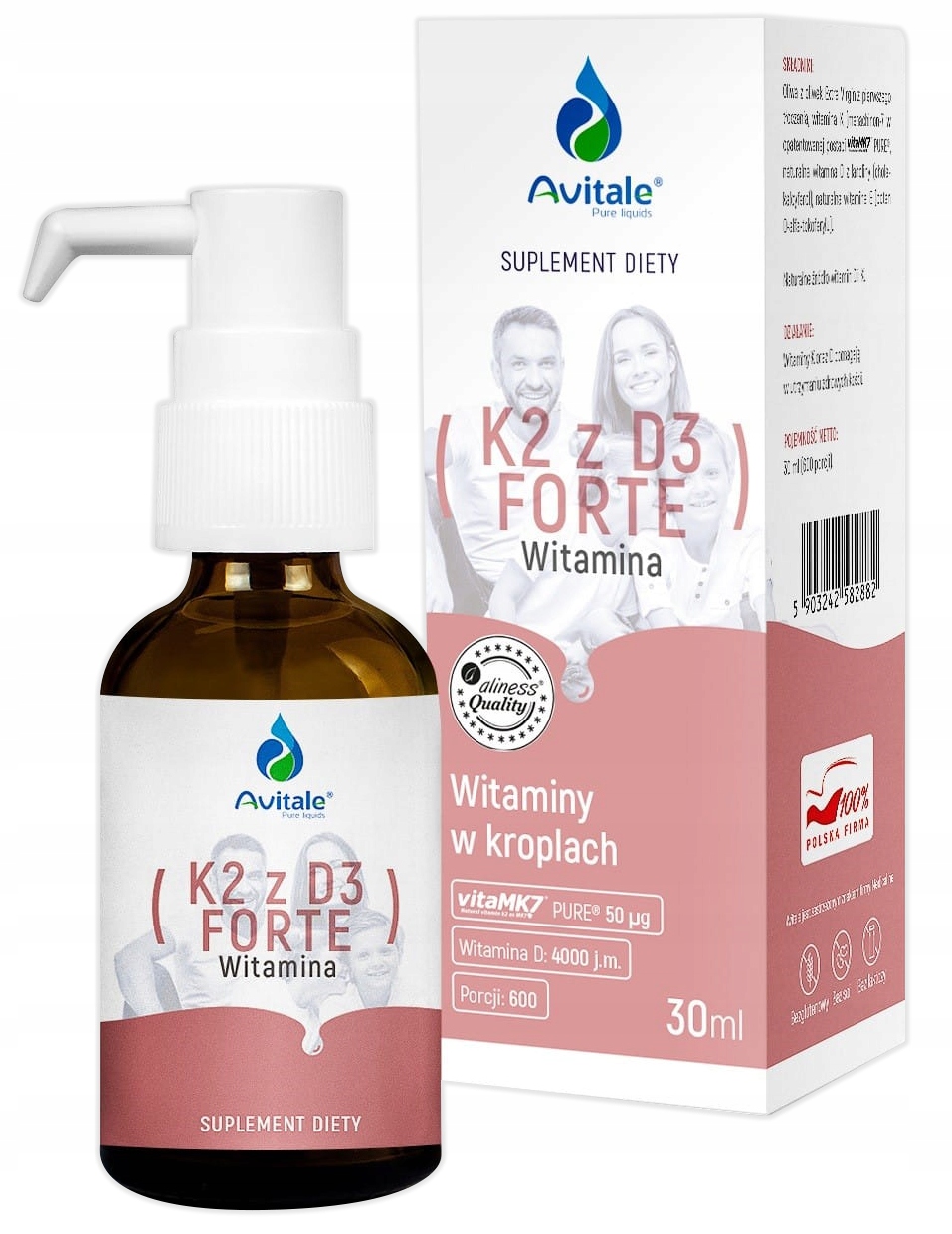 Найвища доза вітамінів в одній краплі! µg Натуральний вітамін K2 MK7 у запатентованій формі vitamk7® і максимальна доза до 4000 МО вітаміну D у вигляді природного холелексиферолу з ланоліну. Вітаміни були розчинені в оливковій олії з першого пресування, завдяки якому вони характеризуються високим вдосконаленням. Кістки