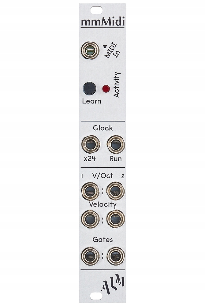 ALM / Busy Circuit mmMidi — простий і компактний інтерфейс MIDI-CV для синтезатора Eurorack. Він перетворює MIDI-тактовий сигнал і 2 канали нотної інформації MIDI, vel і Gate, у відповідні сигнали керування напругою. Запуск mmMidi швидкий і вимагає мінімальної конфігурації