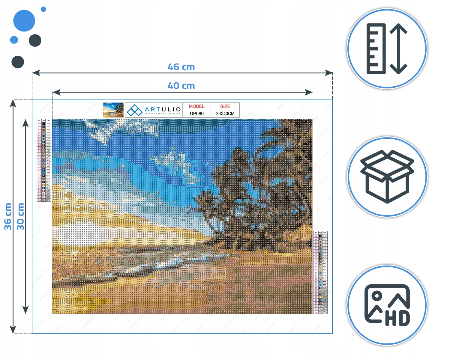 Обираючи набір для алмазної вишивки, звертайте особливу увагу на розміри області наклеювання, а не на розміри всього полотна. Розмір зображення - це найважливіше! - відсутність полів, таблиць і логотипів. Наші описи завжди містять надійні розміри - як схеми, так і полотна!