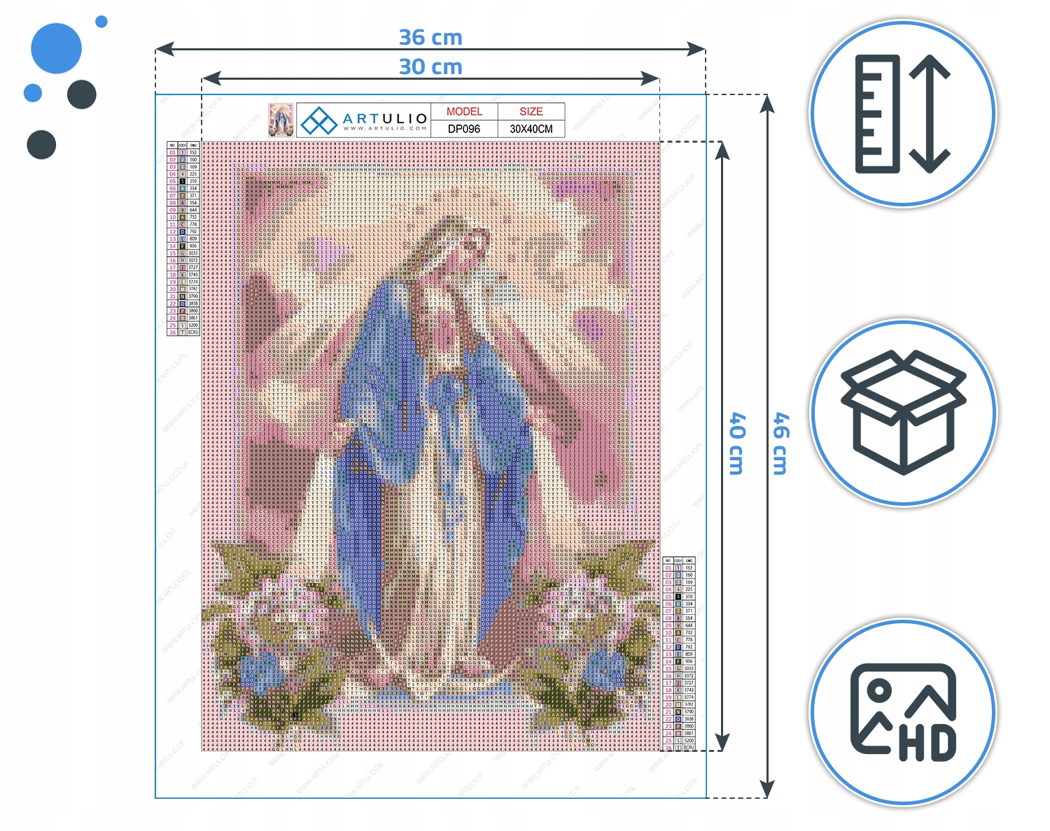 Обираючи набір для алмазної вишивки, звертайте особливу увагу на розміри області наклеювання, а не на розміри всього полотна. Розмір зображення - це найважливіше! - відсутність полів, таблиць і логотипів. Наші описи завжди містять надійні розміри - як схеми, так і полотна!