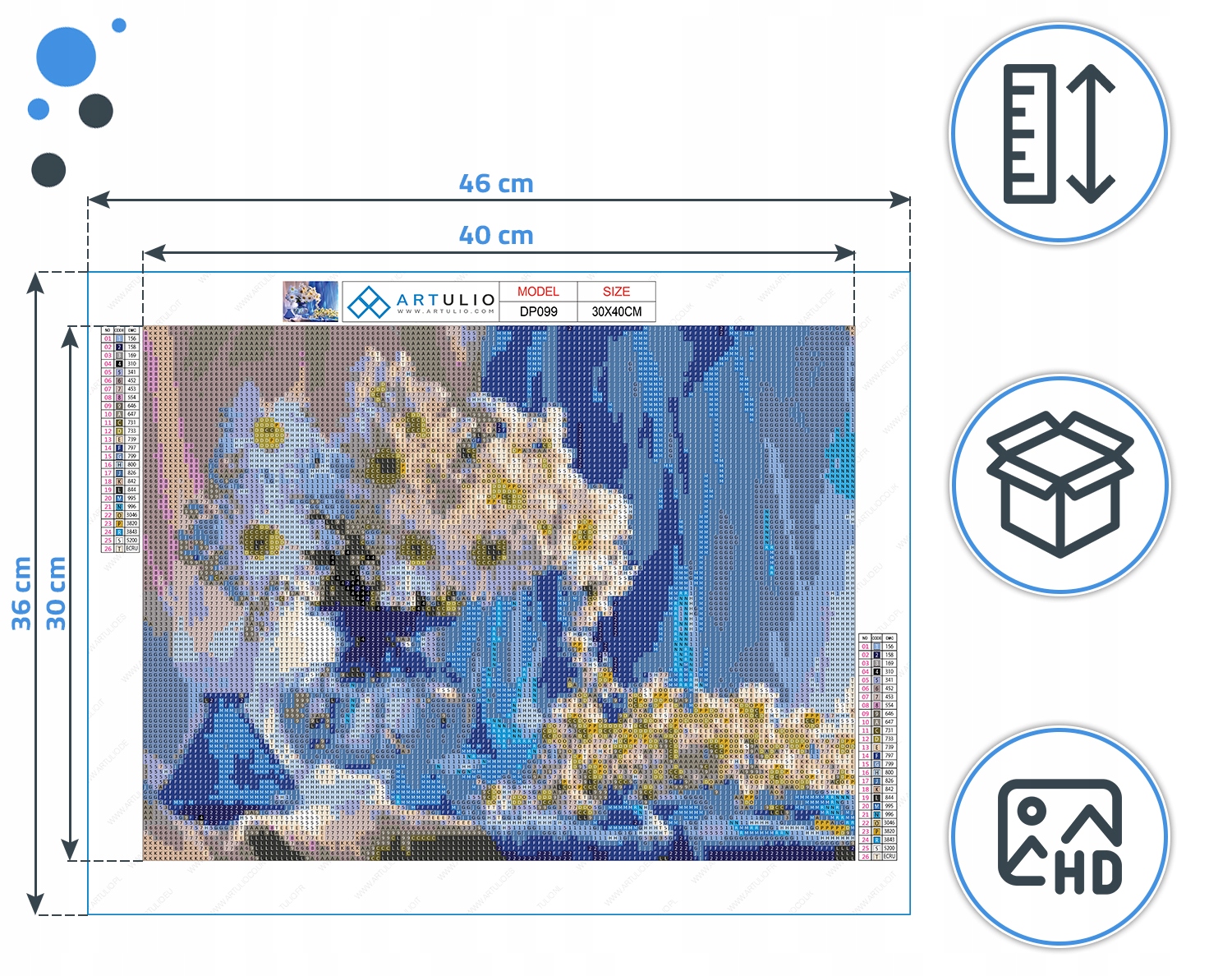 Обираючи набір для алмазної вишивки, звертайте особливу увагу на розміри області наклеювання, а не на розміри всього полотна. Розмір зображення - це найважливіше! - відсутність полів, таблиць і логотипів. Наші описи завжди містять надійні розміри - як схеми, так і полотна!
