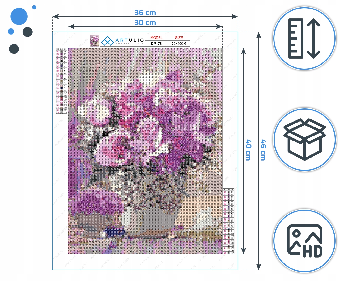 Обираючи набір для алмазної вишивки, звертайте особливу увагу на розміри області наклеювання, а не на розміри всього полотна. Розмір зображення - це найважливіше! - відсутність полів, таблиць і логотипів. Наші описи завжди містять надійні розміри - як схеми, так і полотна!