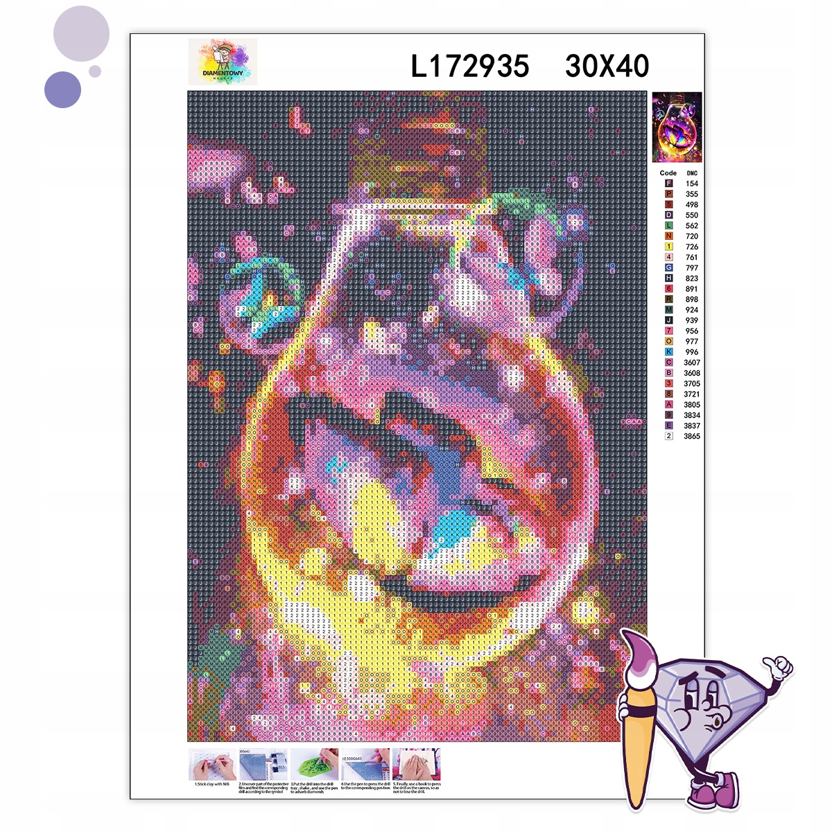 Алмазна вишивка — це не що інше, як створення мозаїки з тисяч маленьких різнокольорових діамантів відповідно до візерунка на полотні. Зображення покрите шаром клею, який утримує кристали в потрібних місцях.