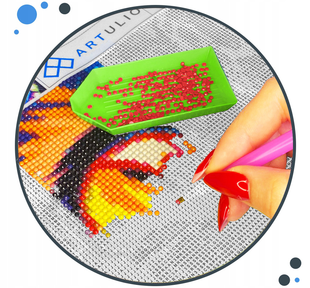 Діамантова вишивка включає в себе мозаїку з тисяч крихітних різнокольорових діамантів відповідно до відбитка на полотні. Зображення вкрите клейовим шаром, який утримує кристали в потрібних місцях.