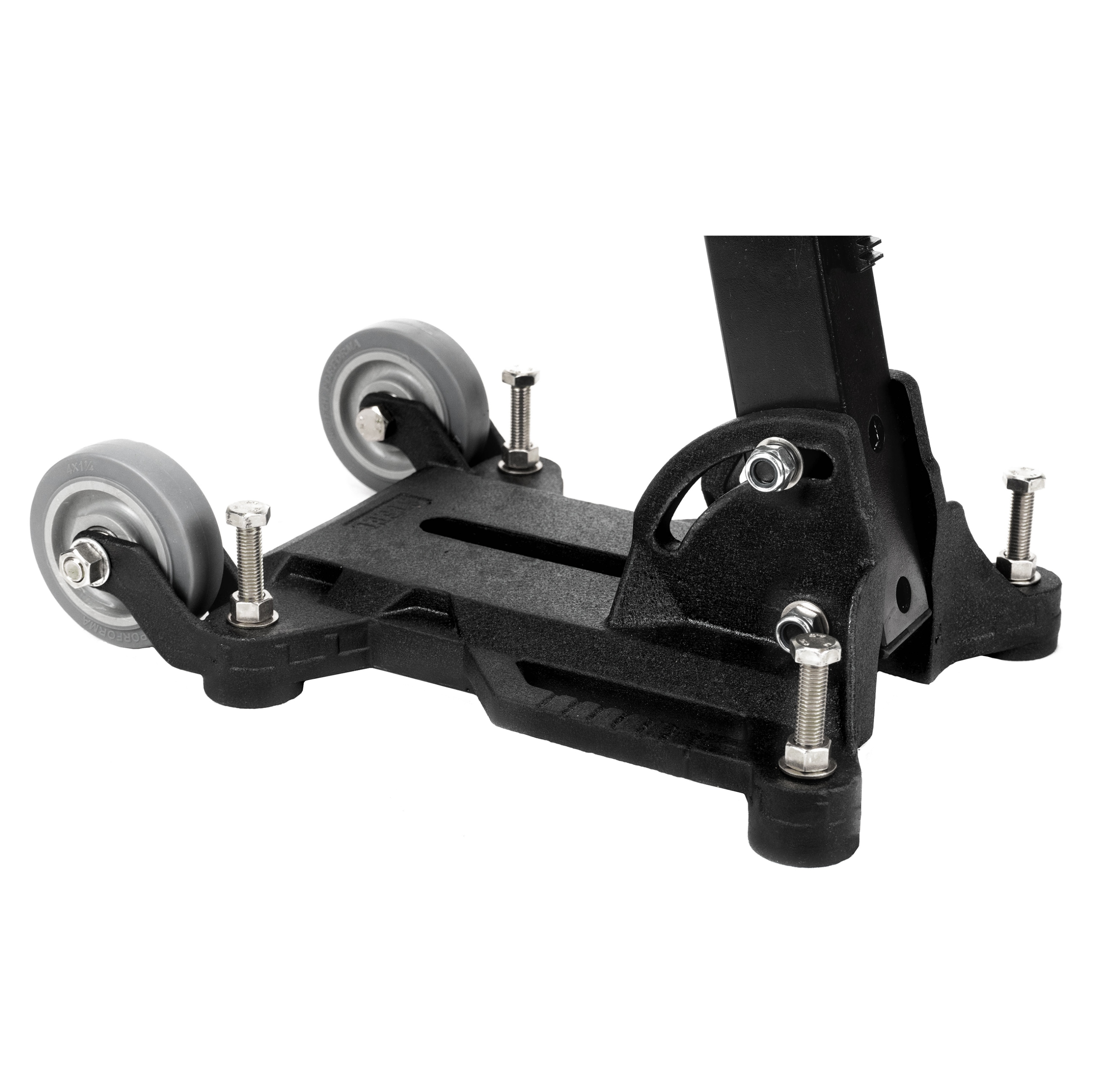 Важіль подачі можна встановити з лівого або правого боку штатива. Рухомі колеса, встановлені в основі штатива, полегшують транспортування.