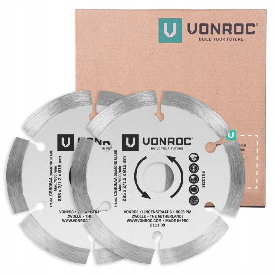 Ці 2 алмазні диски від VONROC мають діаметр 85 мм і оснащені 6 сегментами/зубами. Пильні полотна можна універсально використовувати для компактних циркулярних пилок і пилок для врізного різання діаметром 85 мм і діаметром отвору 15 мм. Підходить для наскрізного та ненаскрізного різання каменю та кераміки. Пильні диски сумісні з пристроєм VONROC S_CS503AC: міні-циркулярна пила / пилка для глибокого різання 500 Вт.