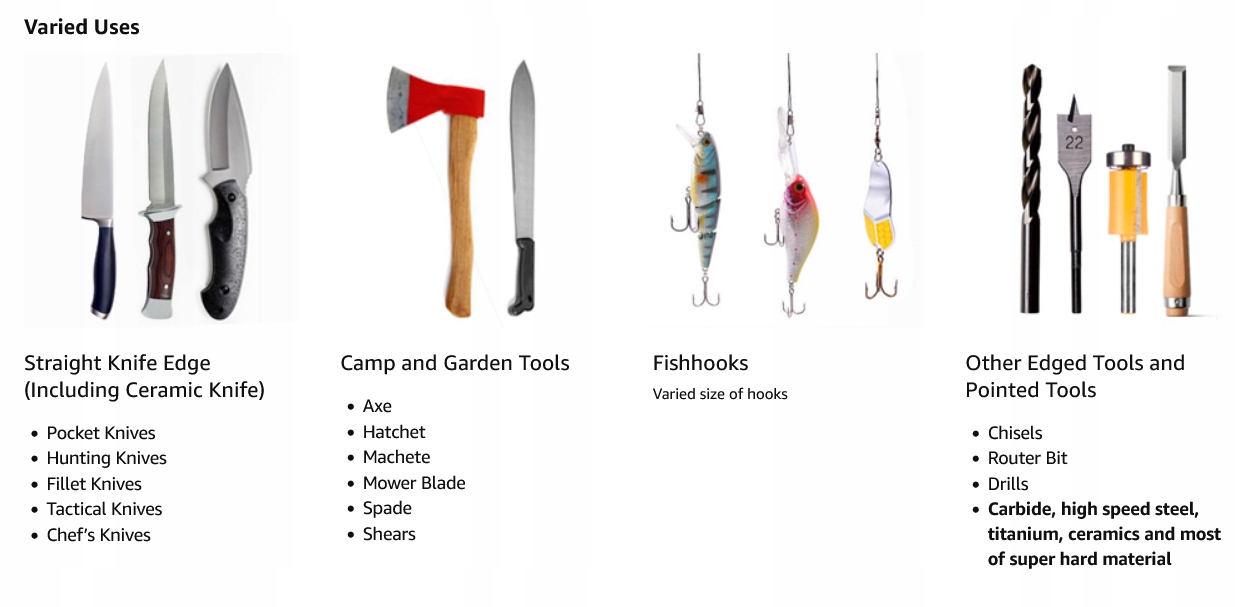 Різноманітні розміри гачків Інші крайові та гострі інструменти Долота Фреза Свердла Твердосплавні, швидкорізальна сталь , титан, кераміка та більшість надтвердих матеріалів