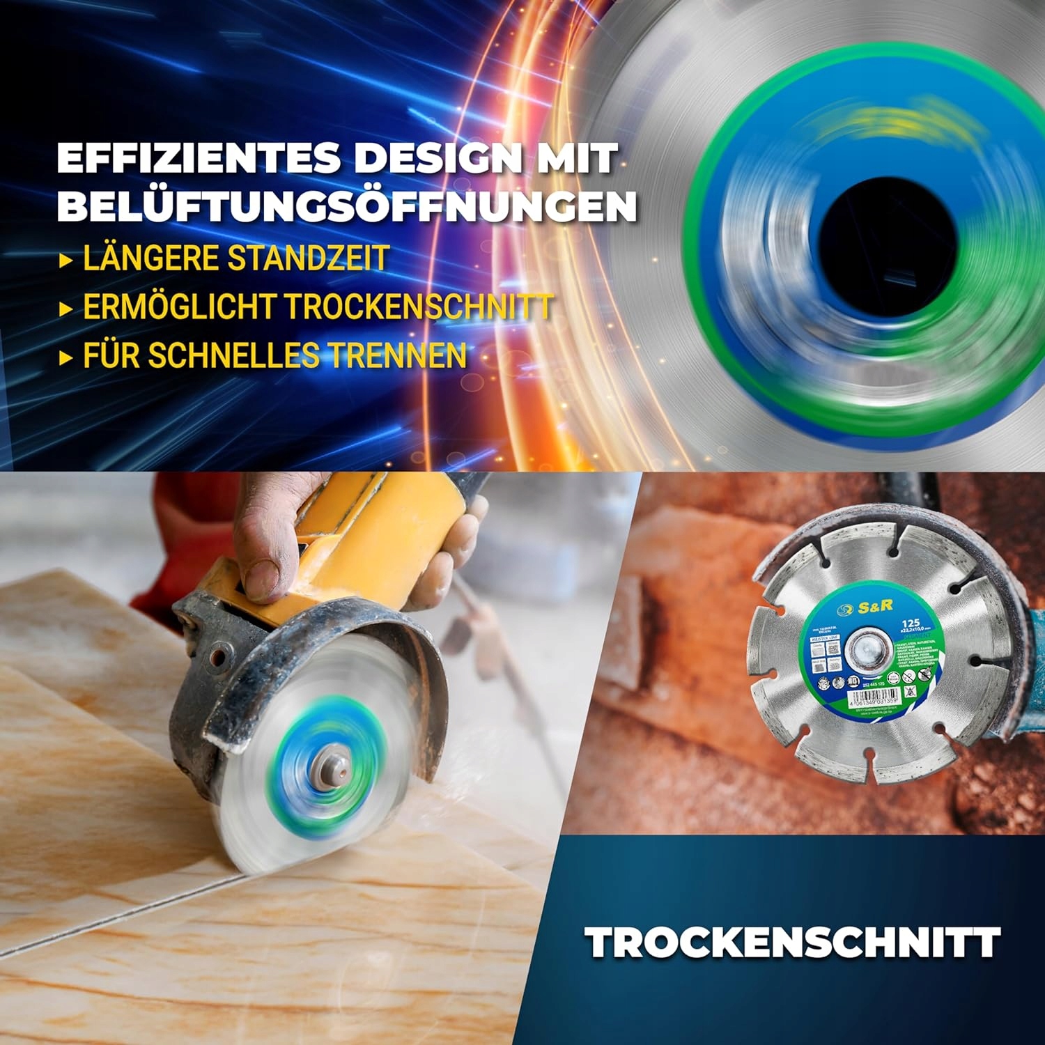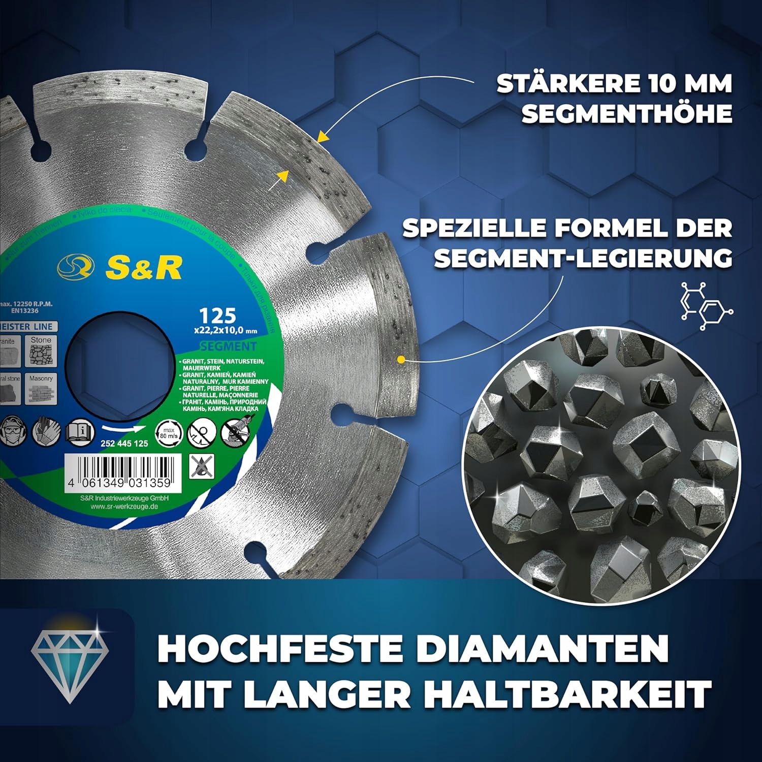 Для алмазних дисків S&R використовуються лише високоякісні сталеві сердечники та надзвичайно стійкі до ударів і високих температур алмази.
